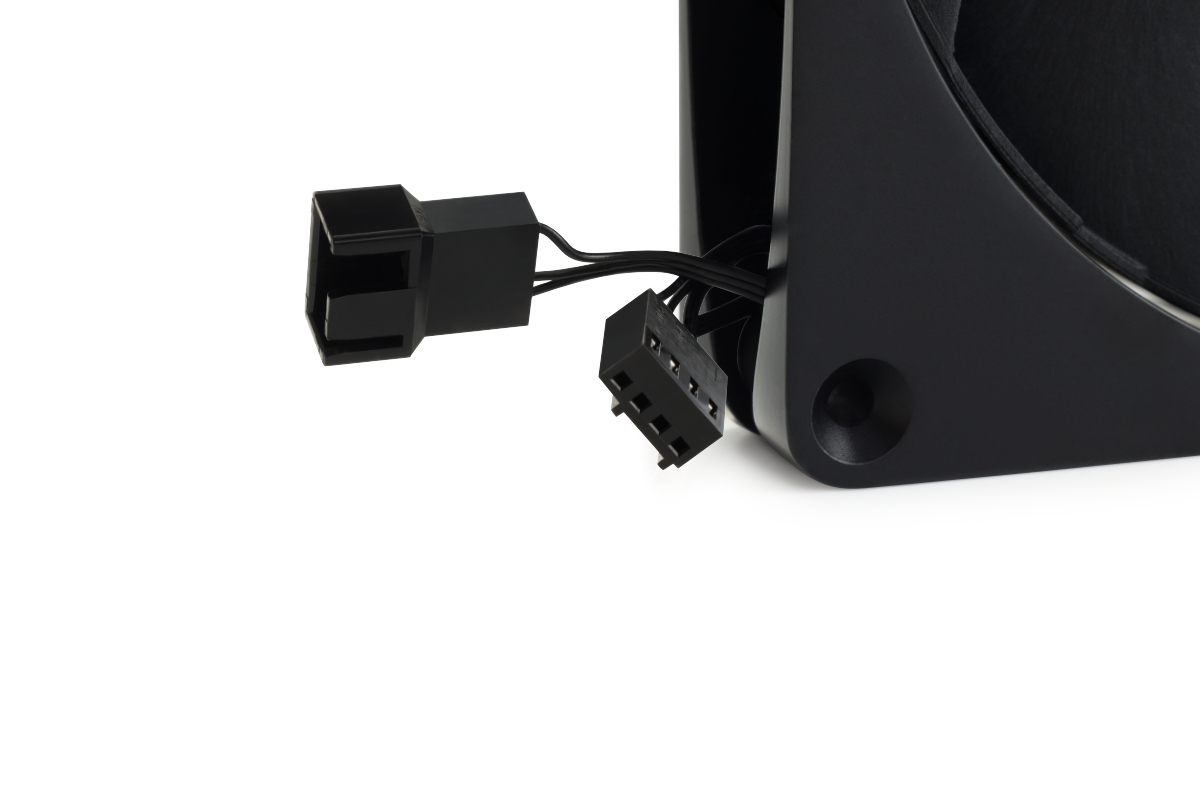 Wie bei Alphacool üblich, lassen sich mühelos mehrere Lüfter per Daisy Chain in Reihe verbinden. Die Kabel können in den Ecken des Lüfters versteckt werden, sodass sie nicht mehr sichtbar sind. Es liegt zudem ein 50 cm langes PWM-Kabel als Verlängerung bei. Der 6-Pol Motor sorgt in Kombination mit dem HDB-Lager (Hydro Dynamic Bearing) für eine extreme Laufruhe und hohe Langlebigkeit.