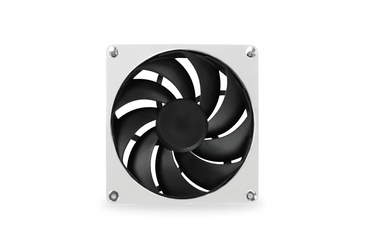 Die Lüfterblätter, der Motor und dessen Aufhängung sind vollständig vom Metallrahmen entkoppelt. Dazu wurde zwischen dem Metallrahmen und dem Lüfter ein spezielles Dämpfungssystem untergebracht, welches sämtliche Vibrationen abfängt. Diese Art der Entkopplung ist ein völlig neues System, welches von Alphacool erstmals mit dem Apex Lüfter auf den Markt gebracht wird. Darüber hinaus ist der Impeller mit einem geschlossenen Rahmen ausgestattet, der ein Flattern der Impellerspitzen bei hoher Drehzahl verhindert, was sich ebenfalls positiv auf die Eigenschaften des Lüfters auswirkt.