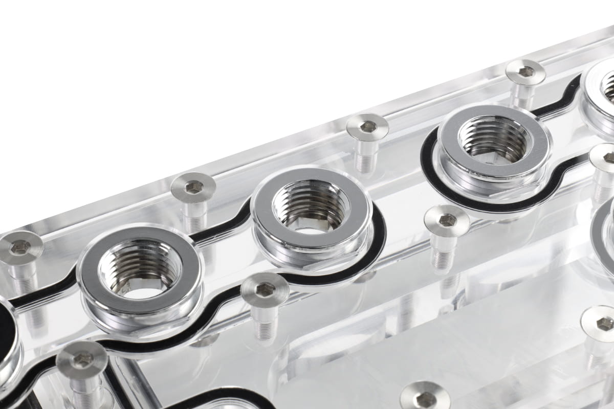 Die Distro Plate ist aus hochwertigem Acrylglas gefertigt und mit verchromten G1/4“-Messinganschlüssen versehen. Diese wurden eingelassen und bewusst nicht verschraubt, um das Risiko von Rissbildungen und Leckagen zu verringern und gleichzeitig die Stabilität zu erhöhen.