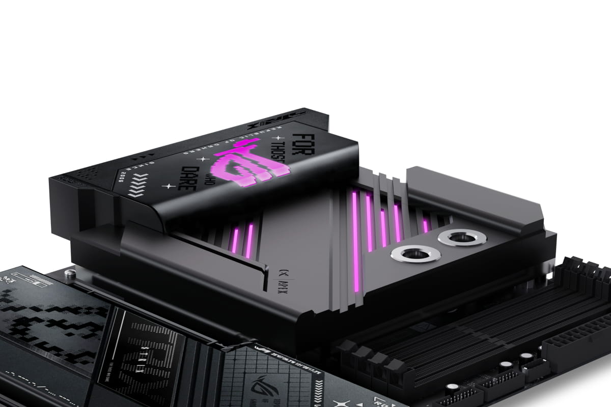 The original LED I/O cover of the motherboard remains fully intact and is complemented by the subtly integrated Apex-style aRGB lighting of the monoblock.