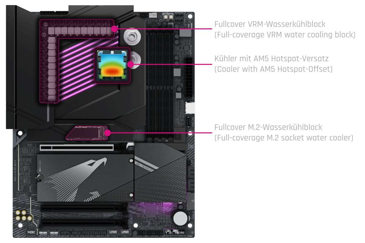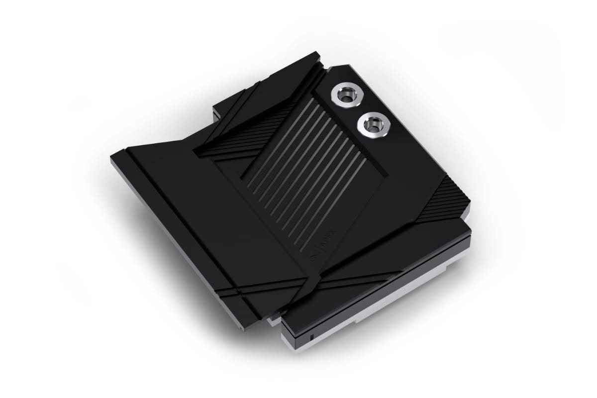 The Apex Monoblock is the ideal cooling solution for maximum performance, combined with an elegant design that is perfectly matched to the motherboard. Developed specifically for the motherboard, the monoblock cools the CPU, the voltage regulators (VRMs), as well as the M.2 NVMe SSD located below the CPU socket. All key motherboard components are actively cooled through the monoblock’s water block.