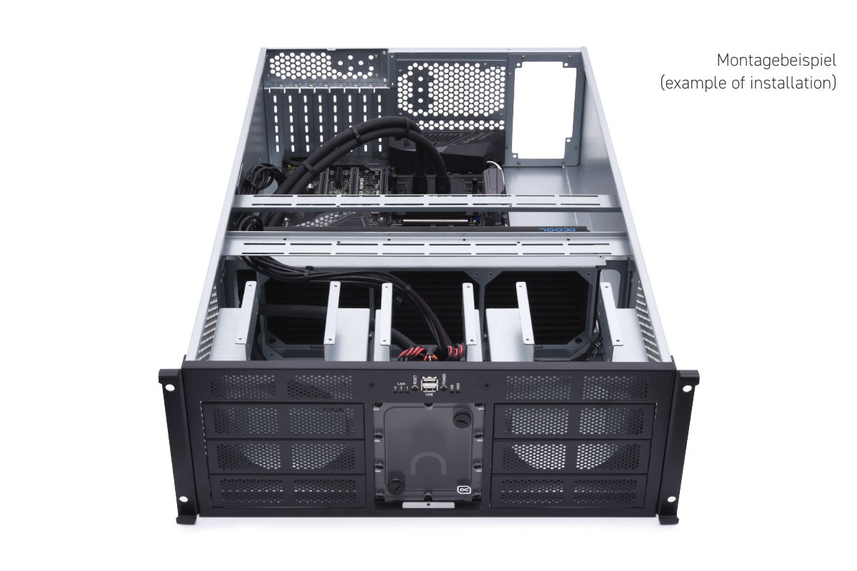 The fans and the radiator are attached to the bracket, which makes future maintenance of these components easier. A single fan or the radiator can be replaced or removed in just a few steps. With this simple installation, the ES 4U Radiator Mounting is an ideal choice for any server operator who values efficient maintenance.