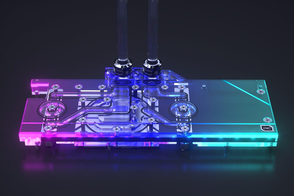 When developing the Eisblock Aurora Acryl GPX graphics card water cooler, emphasis was naturally placed on increasing performance. In the first step, the cooler was brought closer to the individual components by reducing the thickness of the thermal pads. In the second step, the nickel-plated copper block was also made thinner. Step 3 involves the constant optimization of the water flow within the cooler. Result: All important components such as voltage converters and RAM are cooled much better and more effectively by the water and the cooling performance increases significantly.
