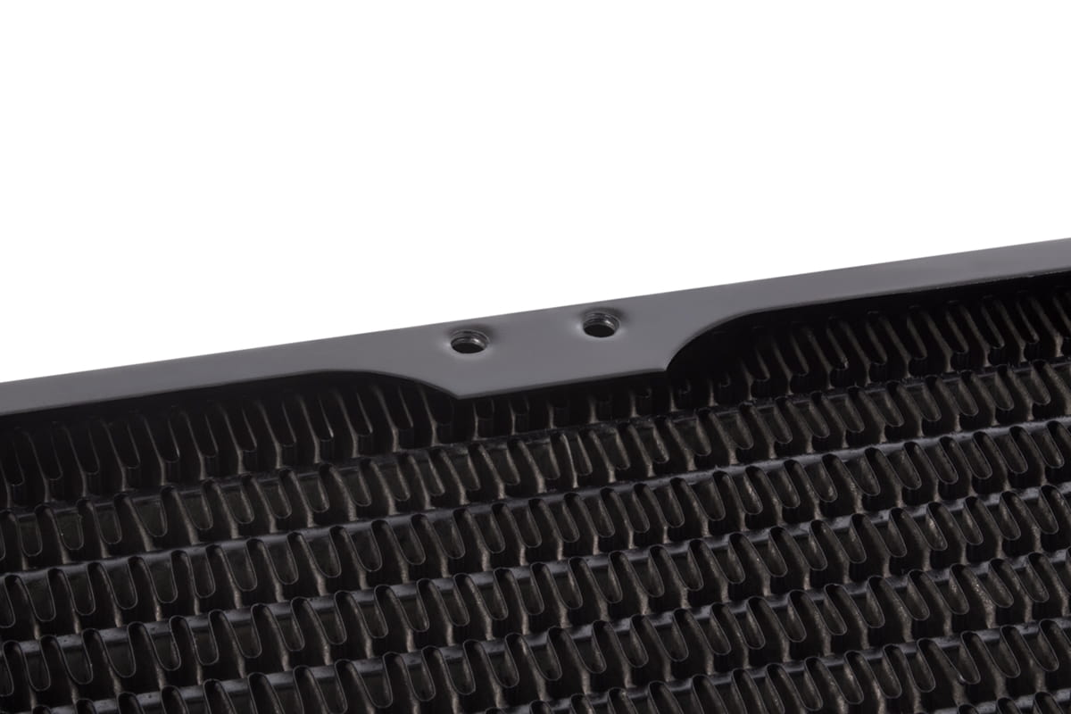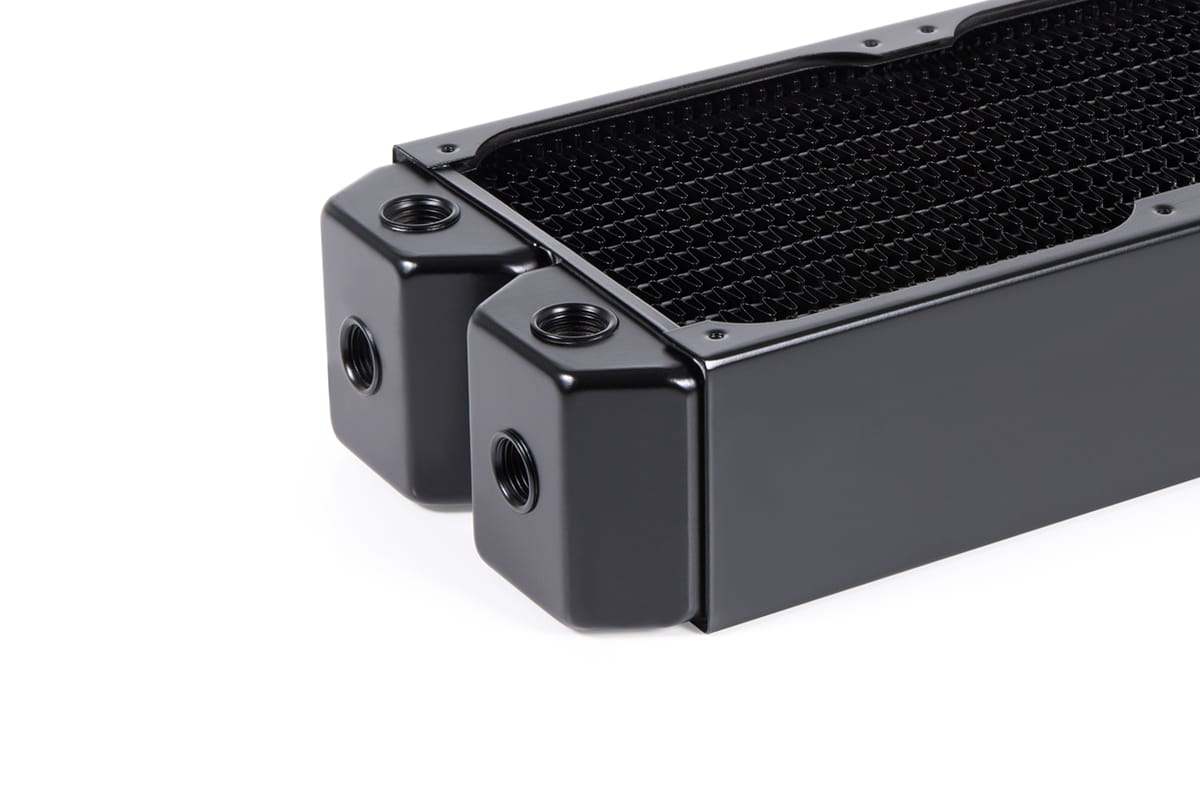 The radiator offers 3 connection options at each input and output. In total, the radiator has 12x G1/4" connections. Thus, versatile mounting requirements can be met. The radiator comes with all screws for mounting inside a case or server rack and for mounting the fans. Additional screws are usually not needed. There is also a protective plate between the mounting holes and the cooling fins. This is to prevent overly long screws from damaging the cooling fins and cooling channels.