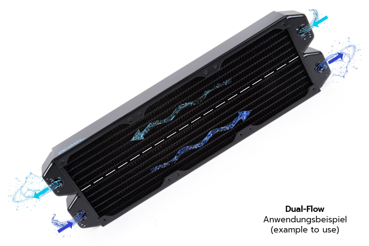 Alphacool Dual-Flow radiators were developed specifically for use in servers. The ability to run two separate loops through one radiator is unique. There are also advantages to using them in a single loop as you can split the cooling surface and use it directly behind hotspots.