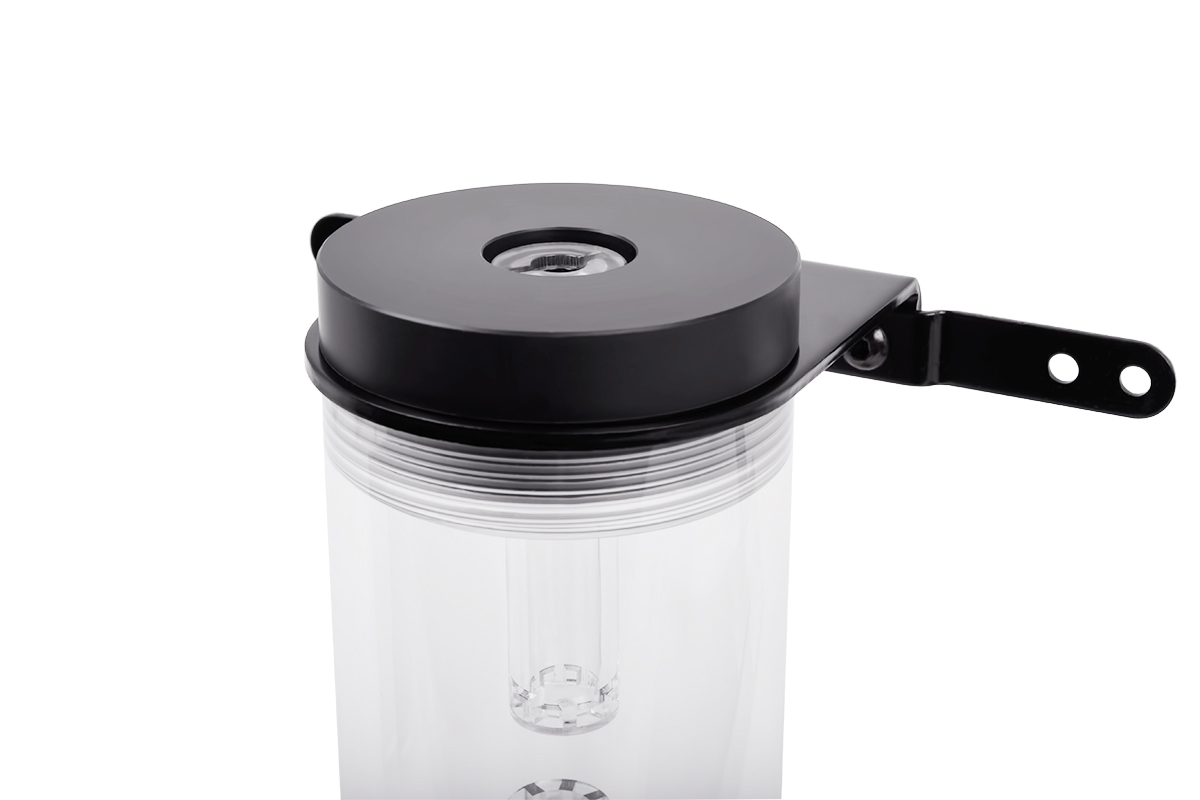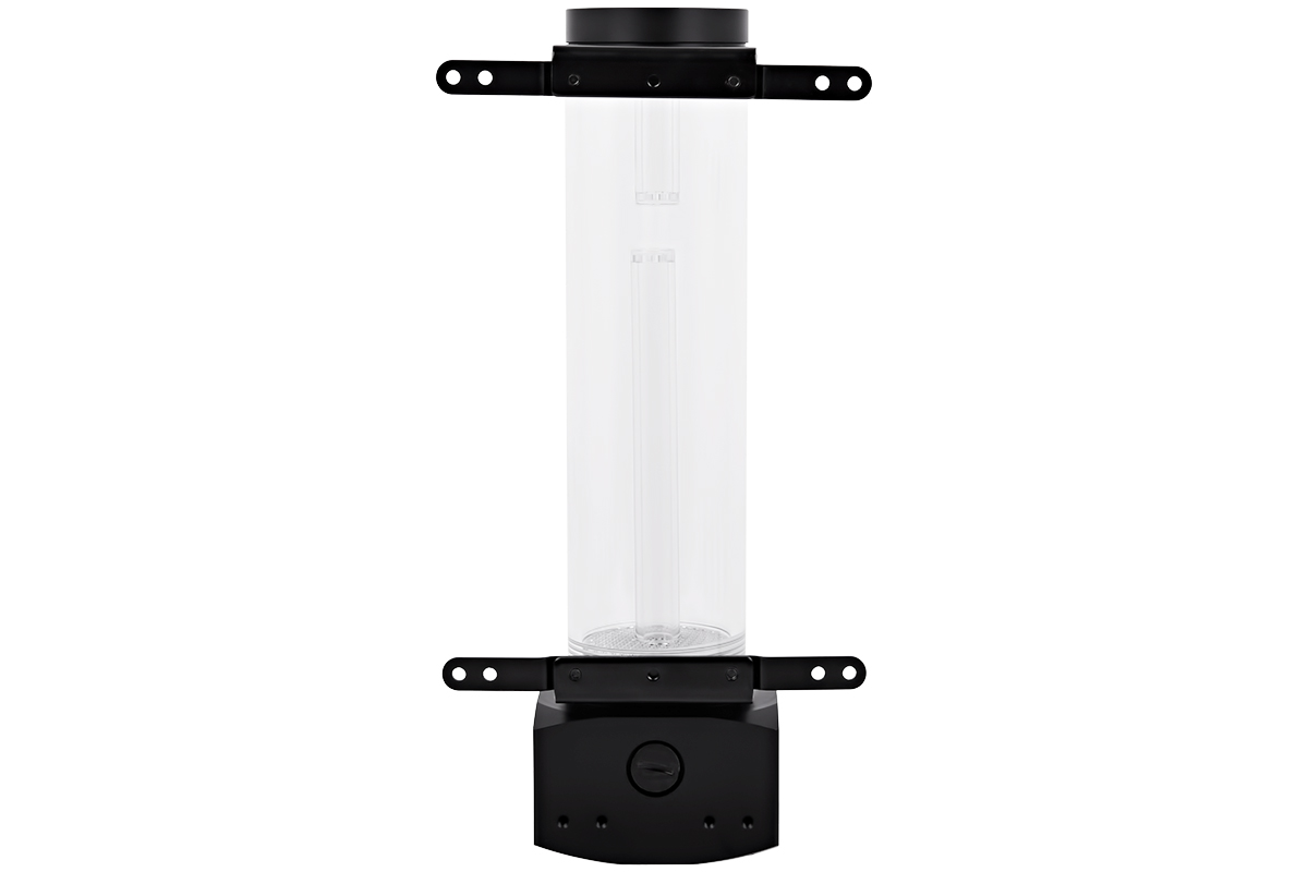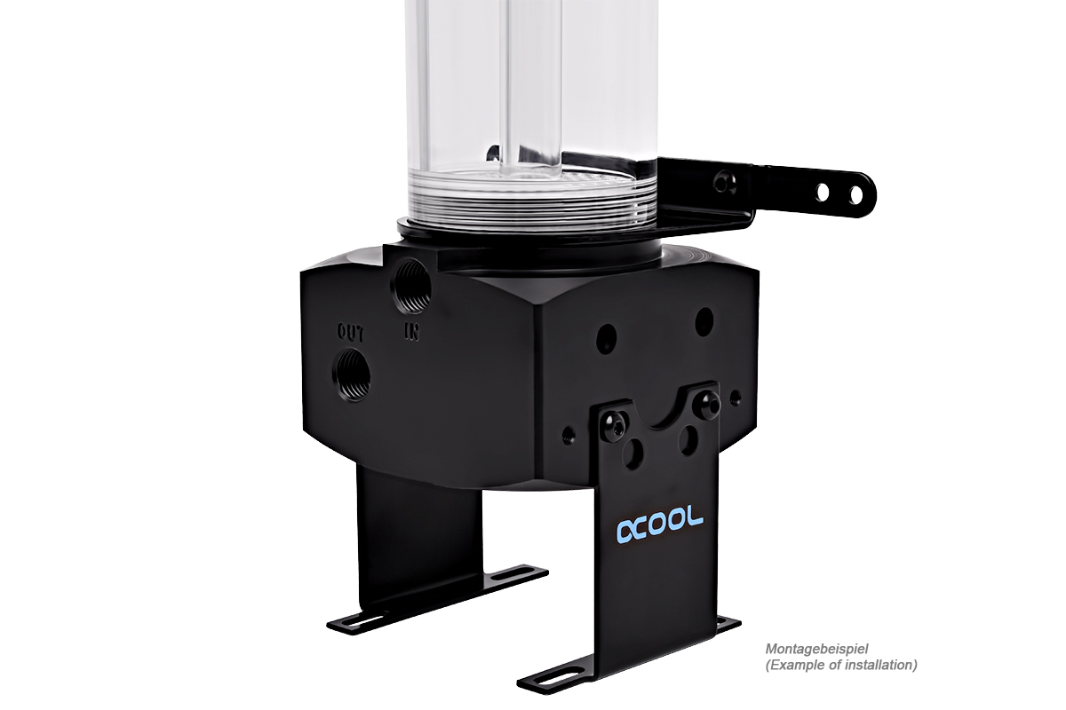 There are two mountings placed above and under the pipe for fastening the lot in the casing. The holes in this mounting have a spacing of a 120/140 cooling fan.You can reduce the width of the mountings up to the width of the reservoir and there are three M4 threads availaible per mounting for fastening if you would rather not mount the reservoir at the fan space. These mountings are easily removeable especially when not being used. You will find these mountings on all 20 reservoirs.
