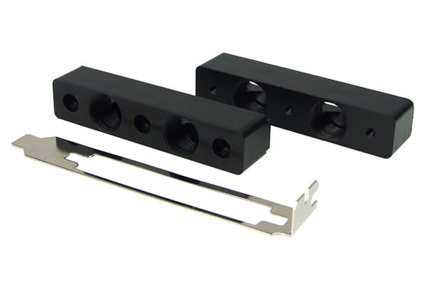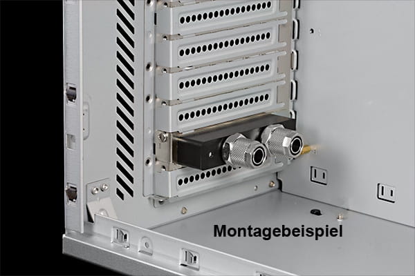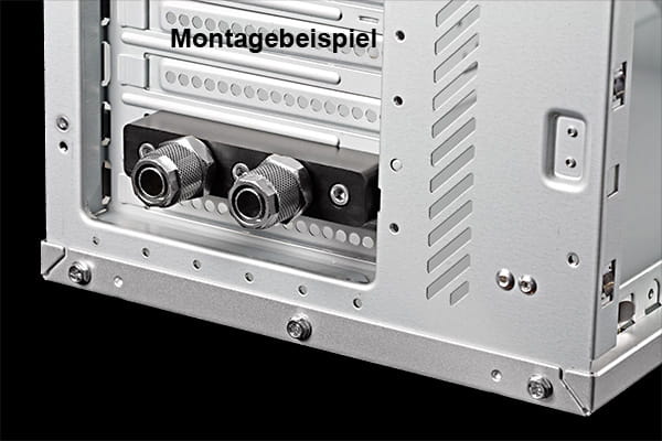 Der aus drei Teilen bestehende Panama HF 38 benötigt für den Einbau kein Werkzeug. Befestigen Sie zuerst das Slotblech wie Sie z.B. auch eine Grafikkarte einbauen. Das Innenteil wird dann mit dem Aussenteil fest verschraubt und intern mit zwei O-Ringen abgedichtet. Verwenden Sie G 3/8 Zoll- Anschlüsse Ihrer Wahl. Angrenzende Nachbarslots werden nicht behindert. In der Regel empfehlen wir aber den untersten freien Slot, damit die Schläuche problemlos verlegt werden können.