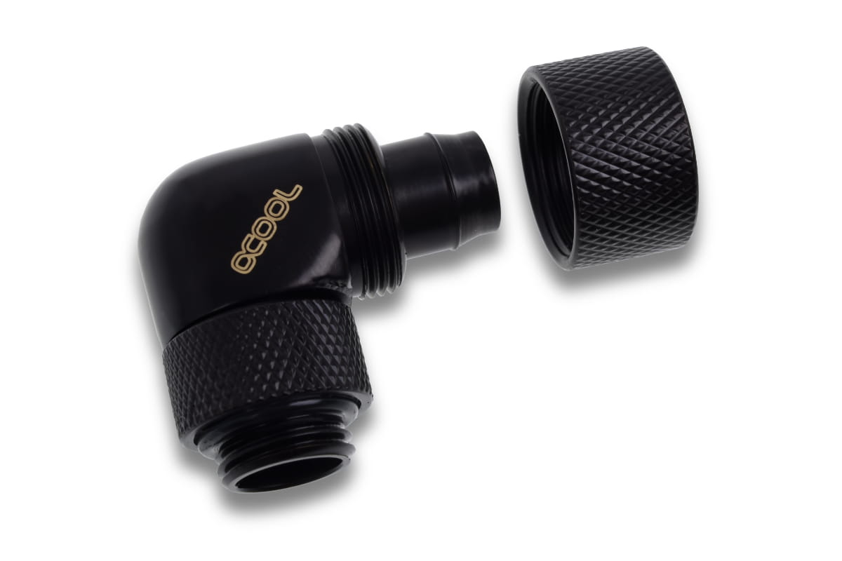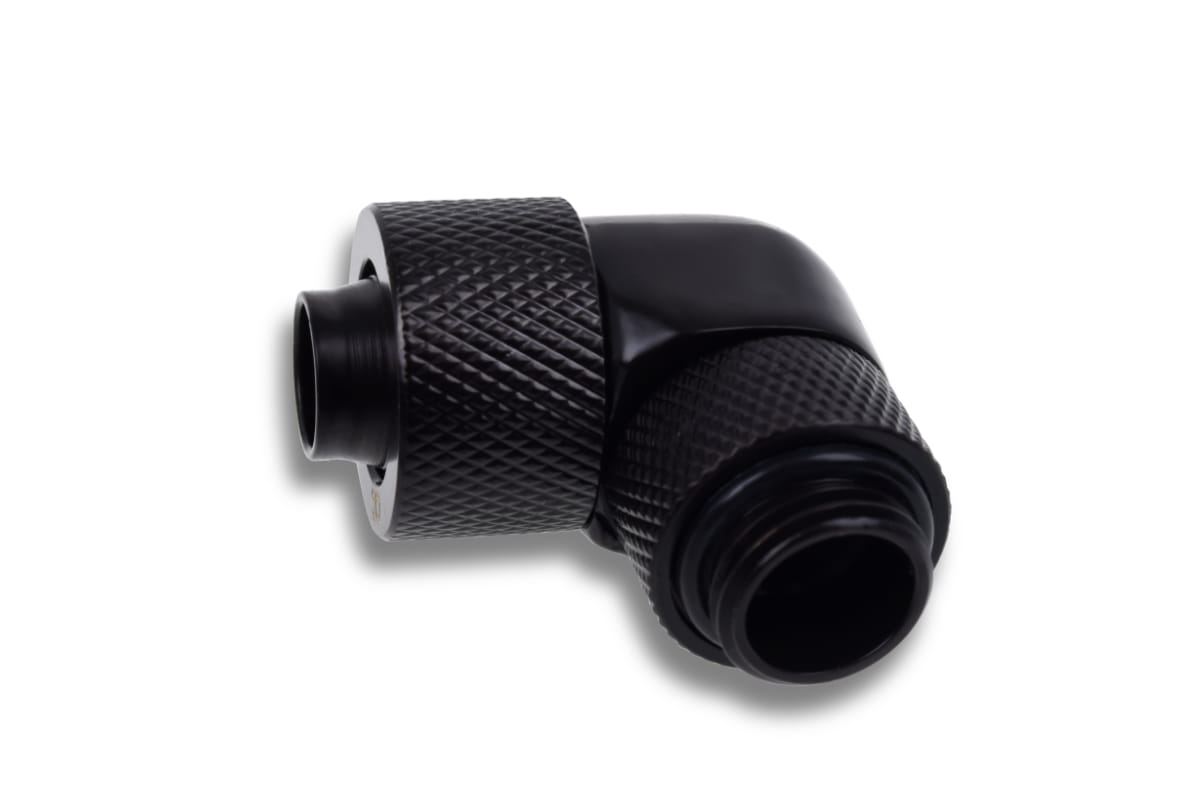 Dieser Anschluss hat auf der einen Seite ein G1/4" Gewinde und ist so mit 95% aller Komponenten kompatibel. Die andere Seite ist passend für einen 13/10mm Schlauch. In der Mitte ist dieser Anschluss um 90° gewinkelt um komplizierte Schlauchwege zu vermeiden. Für maximale Flexibilität ist die Seite mit dem Gewinde drehbar.