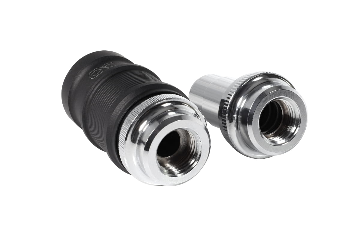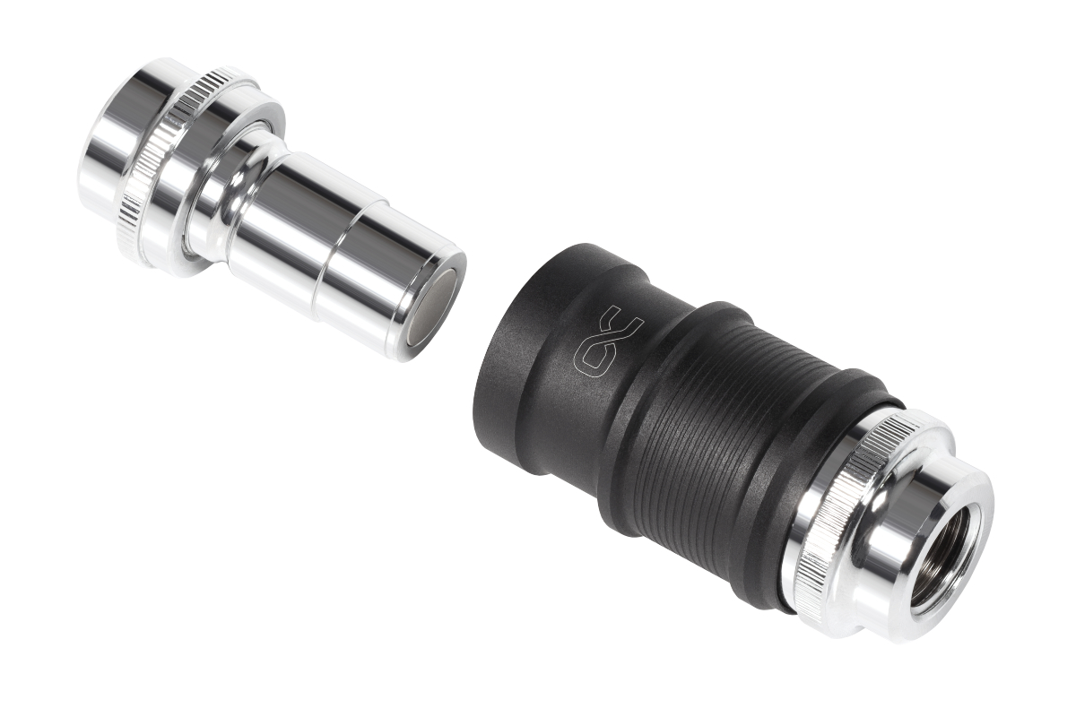 Die ES Schnellverschlüsse von Alphacool vereinfachen den Aufbau des Servers- und Workstation-Systems. Dank der komfortablen Bedienung können komplexe Systeme schnell und problemlos verbunden werden. Um den Schnellverschluss zu öffnen, wird der äußere Ring zurückgezogen. Die Dichtung schließt sofort und verhindert, dass Kühlflüssigkeit austritt. Um die Schnellverschlüsse zu verriegeln, genügt es, sie ineinanderzustecken. Ein Klick-Geräusch bestätigt das sichere Verschließen.
