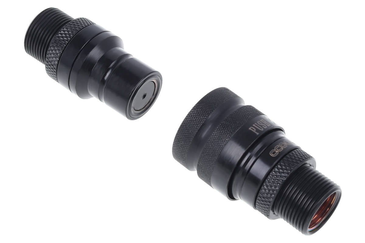 Alphacools Schnellkupplungen sind in zwei Ausführungen erhältlich. In tiefem Schwarz und komplett verchromt fügen diese sich jedem System nahtlos an.