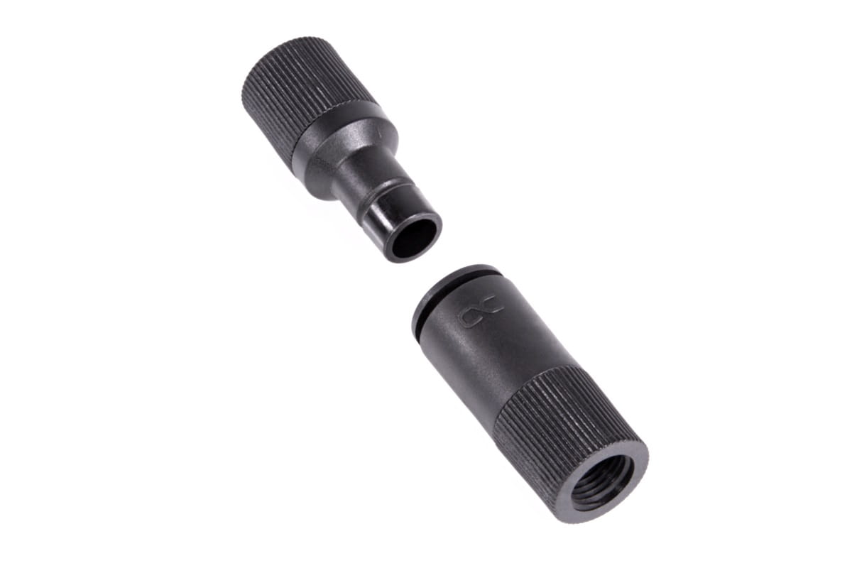Übliche Schnellverschlüsse haben meist einen Durchmesser von teilweise deutlich über 24 mm. Dieser Alphacool Schnellverschluss hat lediglich einen Durchmesser von 20 mm. Damit gehört er wohl zu den dünnsten Schnellverschlüssen für Wasserkühlung am Markt. Zum Verschließen des Schnellverschlusses muss er lediglich zusammengeschoben werden. Um ihn wieder zu öffnen, wird ein kleiner Ring nach hinten gezogen. Dadurch ploppt der Schnellverschluss auf. Der Wasserverlust ist minimal und besteht nur aus 1-2 kleinen Tropfen.