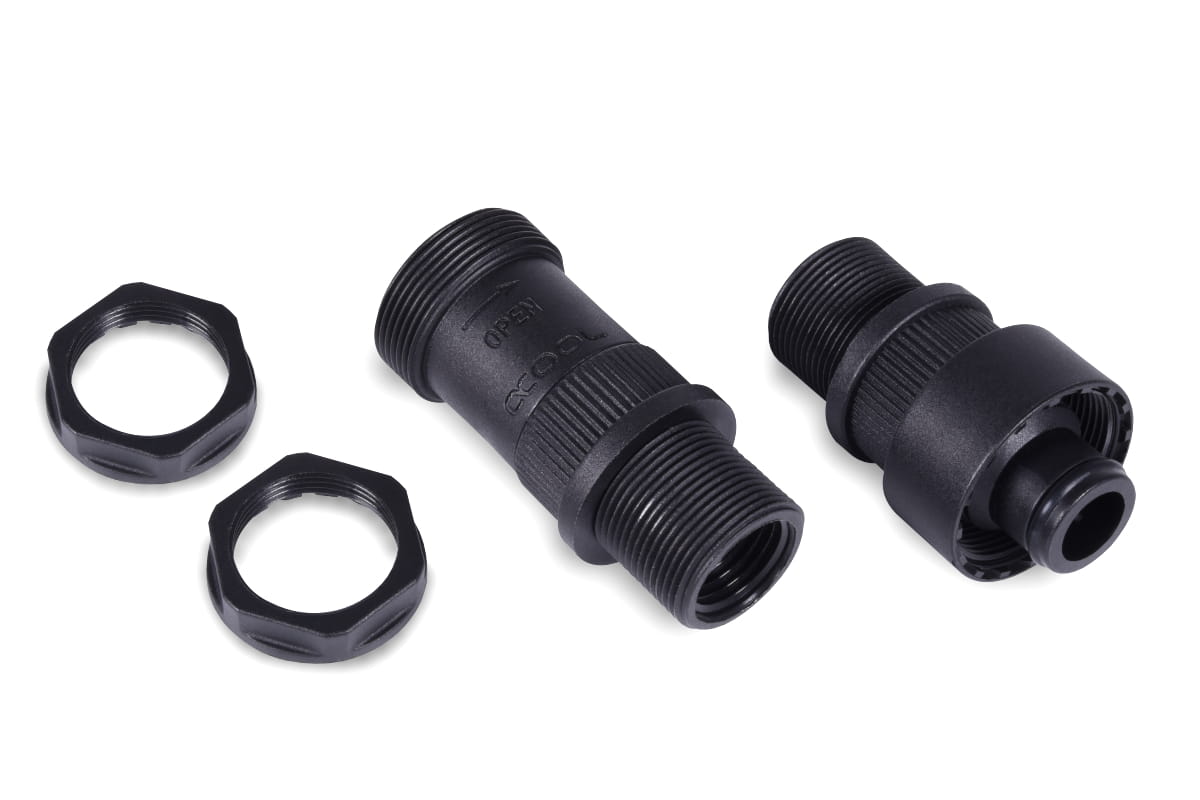 Das Alphacool HF Schnellverschlusskupplungsset IT/IT - bulkhead ist für die dauerhafte Montage an einem PC- oder Servergehäuse geeignet und funktioniert wie eine Schottverschraubung. Die Schnellverschlusskupplung ermöglicht ein schnelles Verbinden oder Trennen von extern angebundenen Radiatoren oder Kühlsysteme