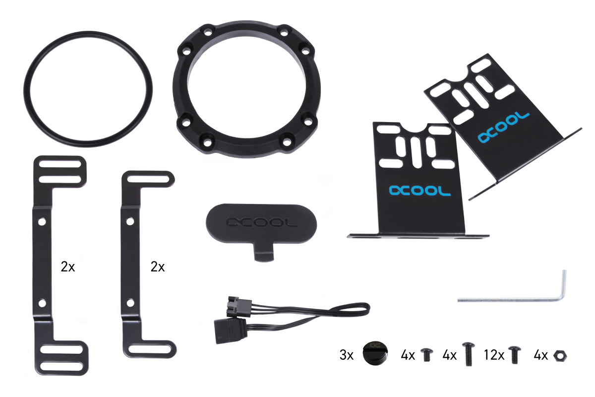 Im Lieferumfang befinden sich 120mm/140mm Montagerahmen, mit denen der Eisbecher Aurora Ausgleichsbehälter beliebig an freien Lüfterplätzen, Radiatoren oder an den Lüftern auf Radiatoren befestigt werden kann.