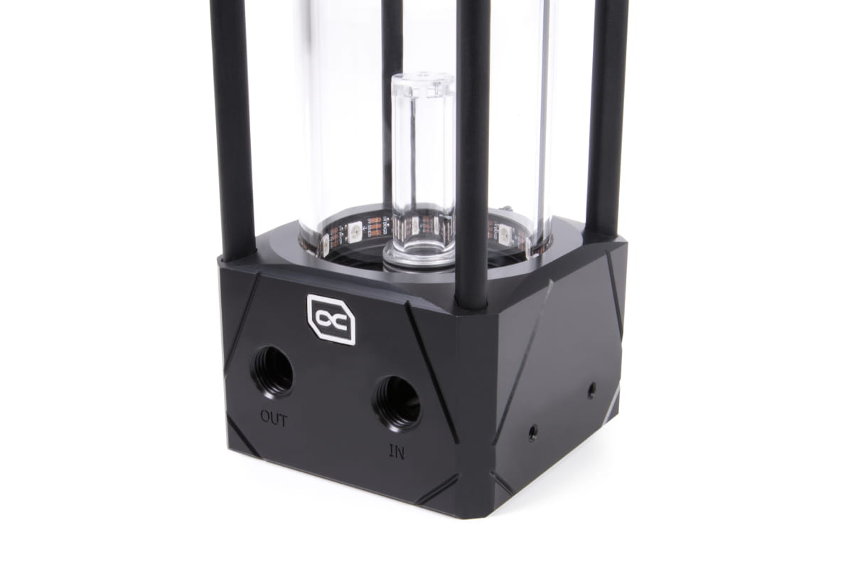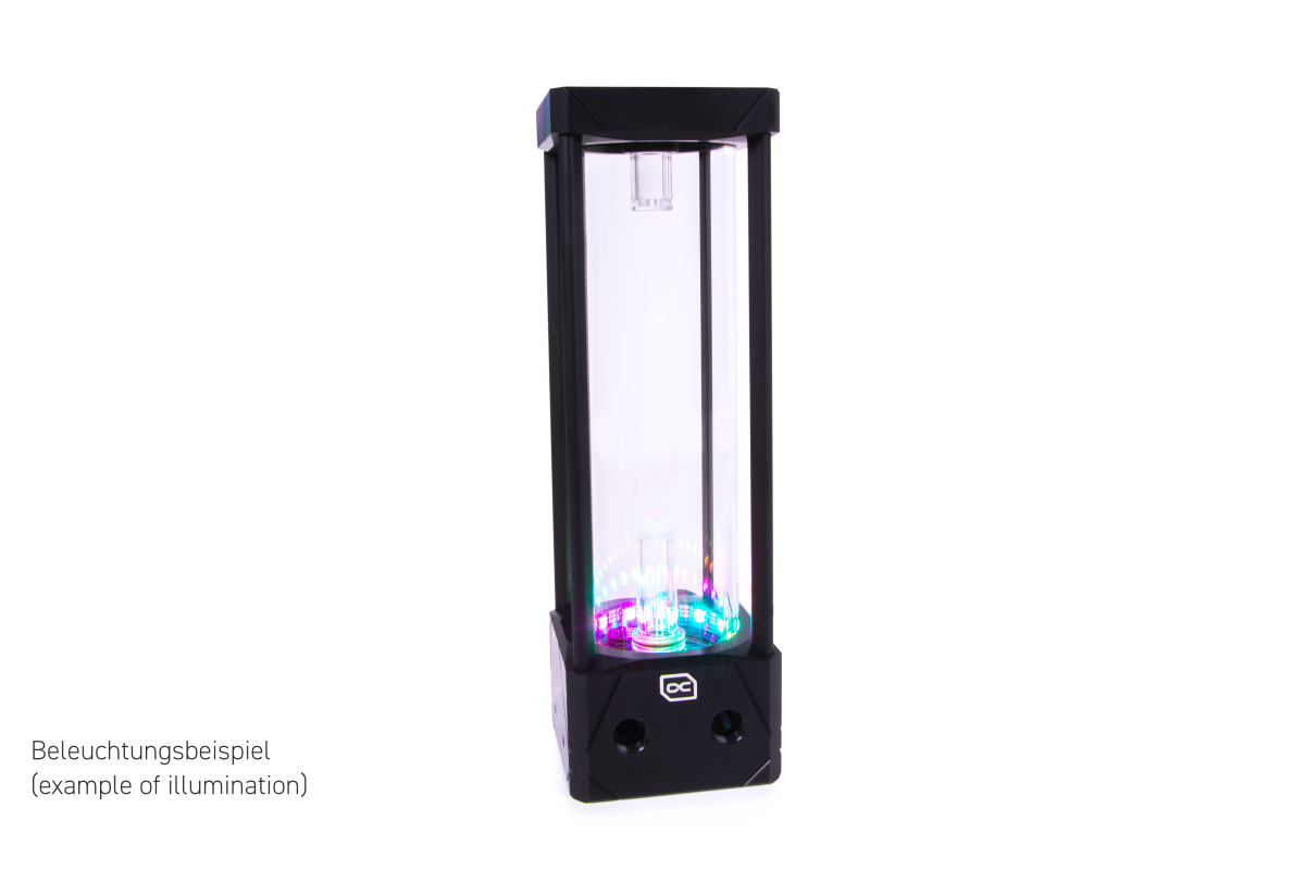 12 digital adressierbare RGB LEDs beleuchten die Glasröhre des Ausgleichsbehälters. Sie sind ringförmig am unteren Ende der Röhre im Übergang zum Pumpentop angebracht und sorgen für eine brillante Ausleuchtung des gesamten Ausgleichsbehälters. Im Zusammenspiel mit dem Lighttower Wassereffekt erreicht man ein ganz besonderes Ambiente. Insbesondere durch die Reflektionen im Echtglas. Die Digitale aRGB LED Beleuchtung wird über einen JST 3-Pin Stecker angeschlossen und kann mit einem Digital-RGB Controller (z.B. Alphacool Aurora Eiscontrol, Art.15360) oder einem Digital-RGB fähigem Mainboard gesteuert werden.