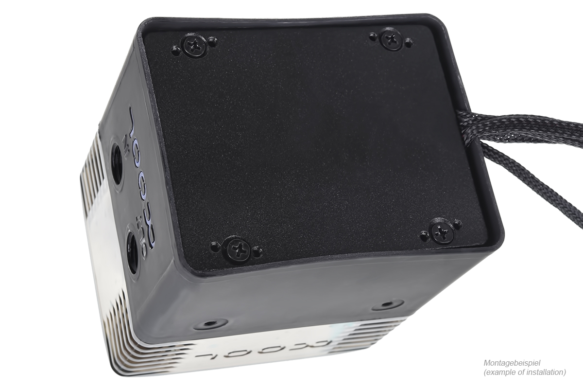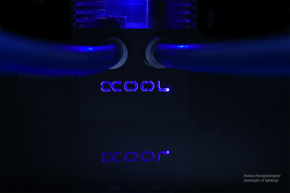 Jeweils ein IN und OUT mit G1/4-Gewinde sind auf der Kopfseite mit dem beleuchtetem Logo zu finden. Im Deckel stehen ein G1/4“- und ein G3/8“-Anschluss zur Verfügung. Der G3/8“-Anschluss erleichtert aufgrund des größeren Durchmessers das Befüllen der Eisstation und kann alternativ als Beleuchtungsmodul für 5 mm-LEDs genutzt werden. Zwei weitere 5 mm-LED-Plätze finden sich zudem im Boden und beleuchten den mit Wasser gefüllten Teil von unten.