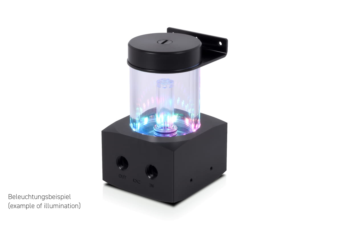 12 digital adressierbare RGB LEDs beleuchten die Aycrylröhre des Ausgleichsbehälters. Sie sind ringförmig am unteren Ende der Röhre im Übergang zum Pumpentop angebracht und sorgen für eine brillante Ausleuchtung des gesamten Ausgleichsbehälters. Im Zusammenspiel mit dem Lighttower Wassereffekt erreicht man ein ganz besonderes Ambiente. Die Digitale aRGB LED Beleuchtung wird über einen JST 3-Pin Stecker angeschlossen und kann mit einem Digital-RGB Controller (z.B. Alphacool Aurora Eiscontrol, Art.15360) oder einem Digital-RGB fähigem Mainboard gesteuert werden.