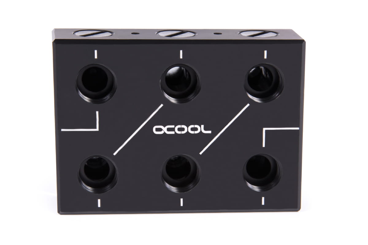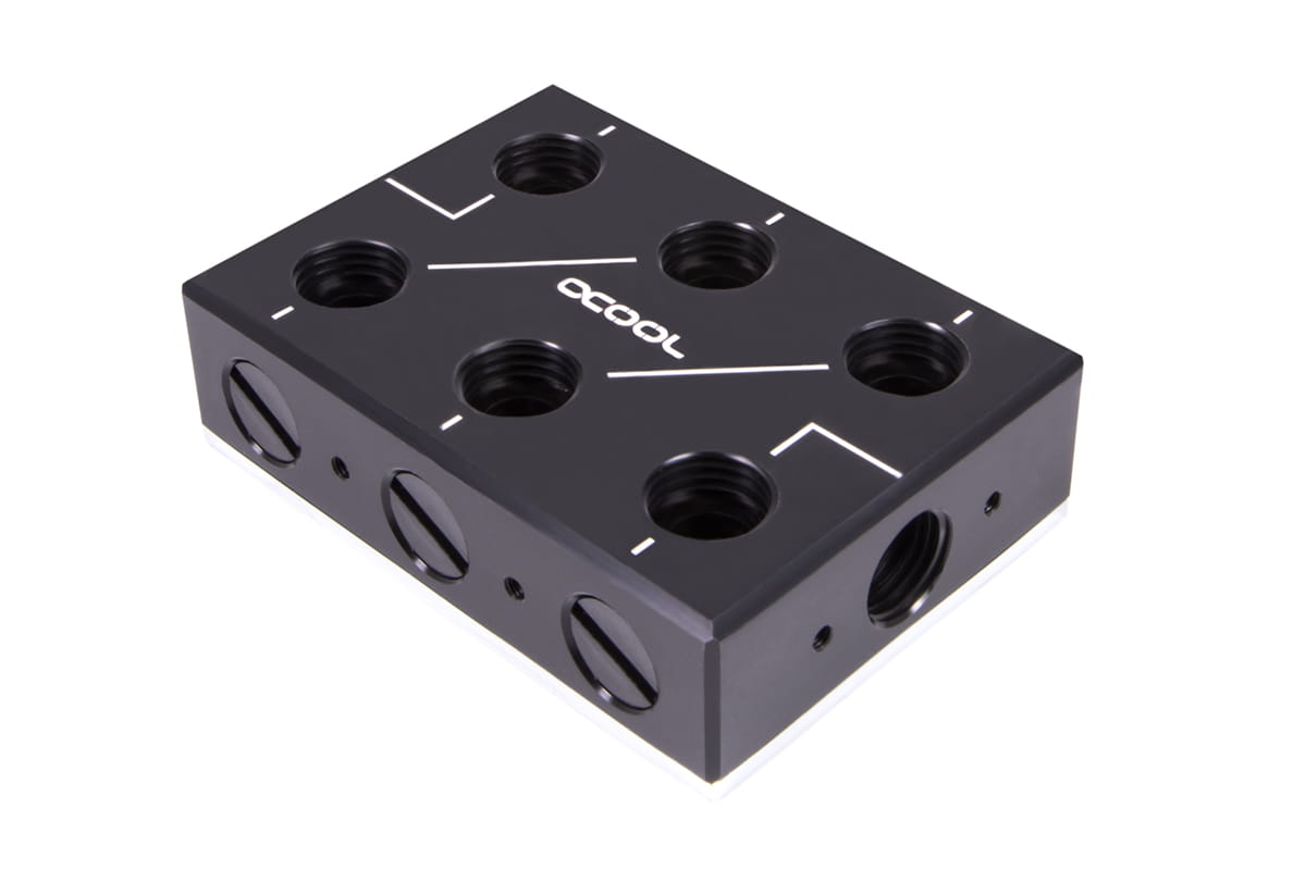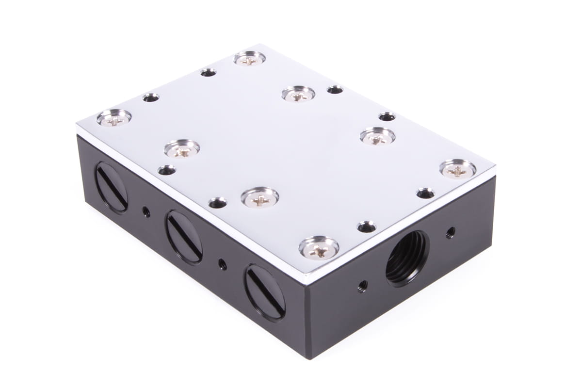 Die ES Distro Plate C3 besitzt insgesamt 14 Anschlussmöglichkeiten im Format G1/4 mit 5mm tiefen Gewinden. Davon befinden sich jeweils 3 Anschlüsse auf jeder langen Seite, 6 auf der Oberseite und jeweils ein Anschlussgewinde an jeder Stirnseite. Man muss jedoch beachten, dass alle Anschlüsse Paarweise angelegt sind. Man kann also nur den oberen oder den seitlichen Anschluss verwenden. Die Ausnahme bilden zwei jeweils drei Anschlussmöglichkeiten an den Stirnseiten. Hier kann jeweils nur der seitliche, obere oder der Anschluss an der Stirnseite verwendet werden. Die genauen Möglichkeiten werden in der Anleitung bildlich dargestellt. Durch diese Konfiguration können alle Komponenten im Wasserkreislauf sehr leicht mit der Distro Plate verbunden werden. Natürlich lassen sich auch mehrere ES Distro Plates in Reihe zusammenschließen.