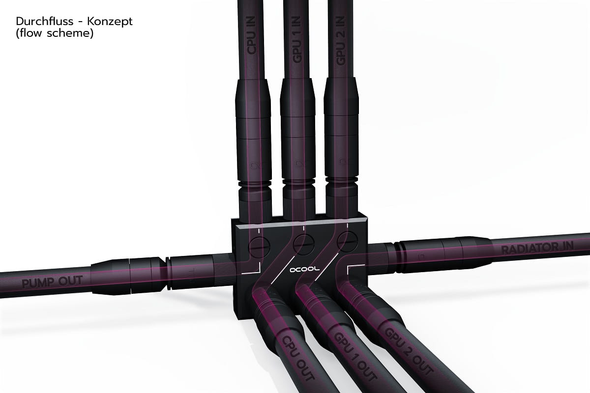 Besonders in engen Servergehäusen ist es unerlässlich einen sauberen Aufbau der Wasserkühlung zu ermöglichen. Wer sich den Wasserkreislauf vorher einmal aufzeichnet, wird schnell den idealen Platz für die Distro Plate finden. Ein idealer Platz ist, wenn alle Schläuche möglichst gerade verlegt werden können. Denn zu engen Biegeradien sollten bei Schläuchen vermieden werden. Wenn Komponenten ausgetauscht werden sollen, ist die Verwendung der Alphacool ES Schnellverschlüsse mit Außengewinde zu empfehlen. So können alle Komponenten im Kreislauf direkt an der Distro Plate mit Schnellverschlüssen montiert werden. Dadurch ist der Austausch von z.B. einem oder mehrere Kühler sehr schnell möglich. Auch weitere oder größerer Radiatoren lassen sich leicht einbinden bzw. austauschen.