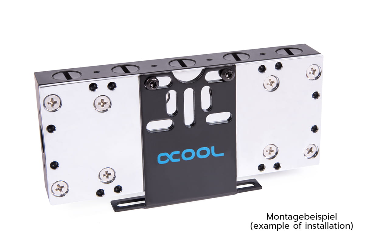 Die ES Distro Plates lassen sich vielseitig montieren. Die einfachste und schnellste Variante ist die Montage über den beiliegenden selbstklebenden Klettverschluss. Dabei wird eine Seite direkt an die Distro Plate geklebt, die andere Seite an eine beliebige Stelle im Gehäuse. Danach kann man die Distro Plate einfach auf den Klettverschluss draufsetzen. Im Lieferumfang sind spezielle Füße und Montagerahmen enthalten, die mehrere Einbauoptionen bieten. Mit dem Montagezubehör lässt sich die Distro Plate an jeden 120 oder 140 mm Lüfterplatz montieren. Die beiliegenden Füße bieten ebenfalls viele Montageoptionen, darunter auch eine Vertikale Montagemöglichkeit an einem einzelnen Fuß. Diverse Gewindebohrungen auf den Seiten und auf der Rückseite der ES Distro Plate bieten weitere direkte Montagemöglichkeiten, darunter auch angepasste Bohrungen für spezielle Montageschienen in den Serverracks von Alphacool.