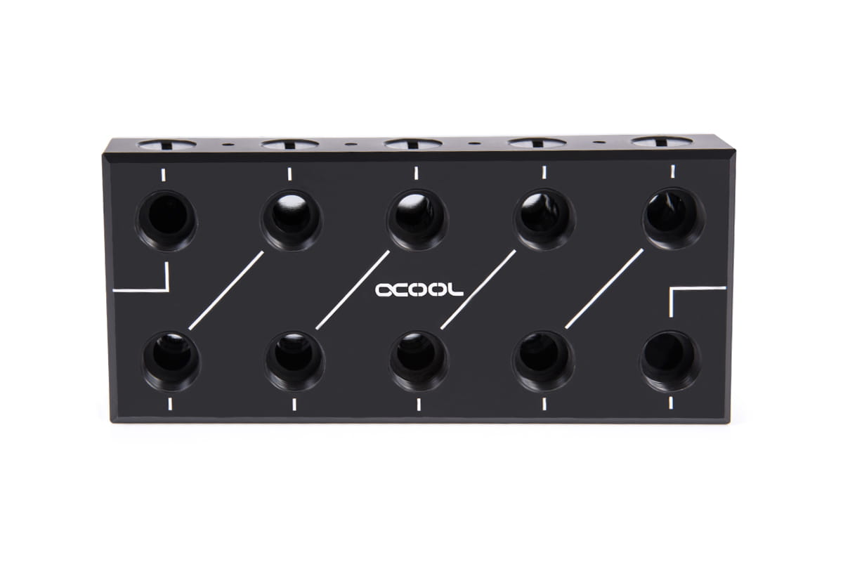 Die ES Distro Plate C5 besitzt insgesamt 22 Anschlussmöglichkeiten im Format G1/4 mit 5mm tiefen Gewinden. Davon befinden sich jeweils 5 Anschlüsse auf jeder langen Seite, 10 auf der Oberseite und jeweils ein Anschlussgewinde an jeder Stirnseite. Man muss jedoch beachten, dass alle Anschlüsse Paarweise angelegt sind. Man kann also nur den oberen oder den seitlichen Anschluss verwenden. Die Ausnahme bilden zwei jeweils drei Anschlussmöglichkeiten an den Stirnseiten. Hier kann jeweils nur der seitliche, obere oder der Anschluss an der Stirnseite verwendet werden. Die genauen Möglichkeiten werden in der Anleitung bildlich dargestellt. Durch diese Konfiguration können alle Komponenten im Wasserkreislauf sehr leicht mit der Distro Plate verbunden werden. Natürlich lassen sich auch mehrere ES Distro Plates in Reihe zusammenschließen.