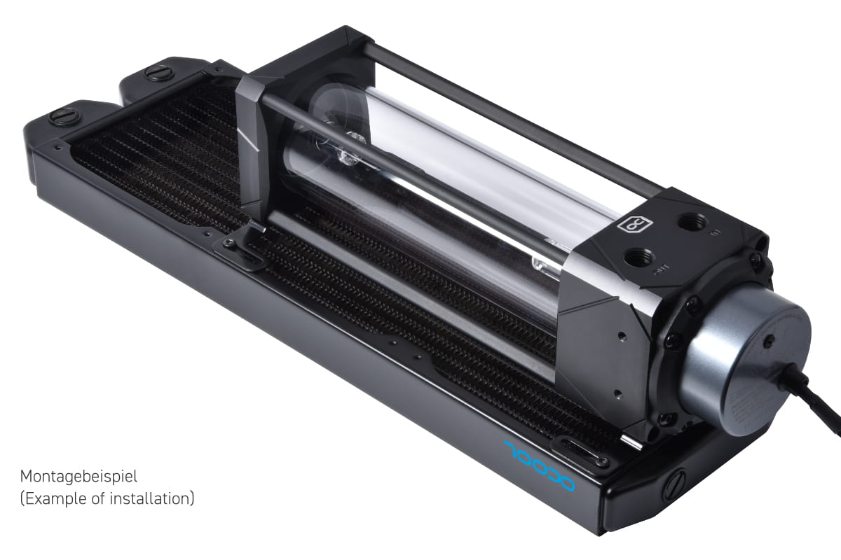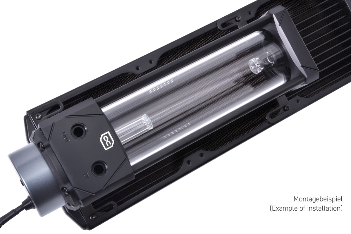 In der Front befindet sich ein Radiator mit Lüftern im Push-Betrieb, die Luft in das Gehäuse blasen. Mit Hilfe des Montagekits kann der Eisbecher Ausgleichsbehälter auf der Rückseite des Radiators platzsparend befestigt werden, ohne den Luftstrom zu beeinträchtigen. Dies ist nur ein mögliches Beispiel und es steht ihnen frei, weitere Montagemöglichkeiten zu nutzen.