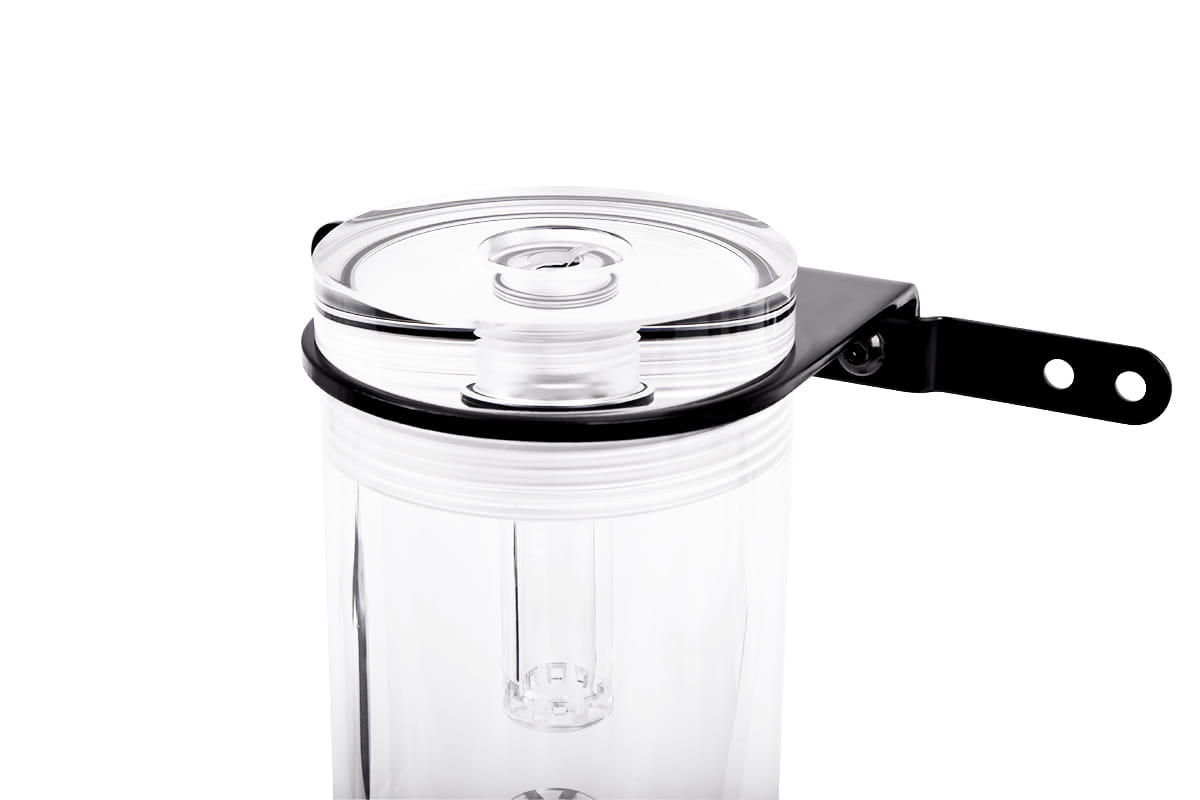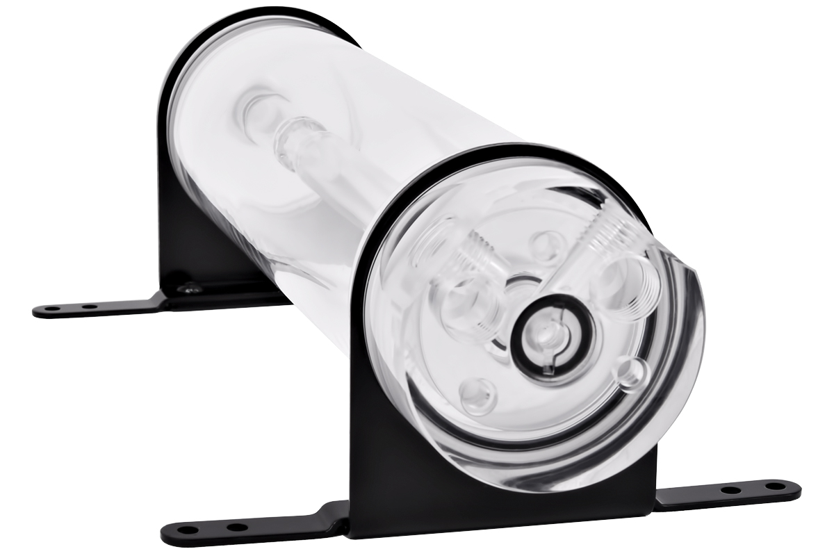 Zur Befestigung im Gehäuse sind zwei Halterungen ober- und unterhalb des Rohrs verbaut. In diesen Halterungen sind Löcher im Abstand eines 120er bzw. 140er Lüfters. Soll der Behälter allerdings nicht an Lüfterplätze montiert werden, lassen sich die Halterungen auf die Breite des Behälters reduzieren und es stehen drei M4 Gewinde je Halterung für die Befestigung zur Verfügung. Auch wenn die Halterungen gar nicht verwendet werden, lassen sich diese ganz einfach entfernen. Diese Halterung ist bei allen 20 Behältern wiederzufinden.
