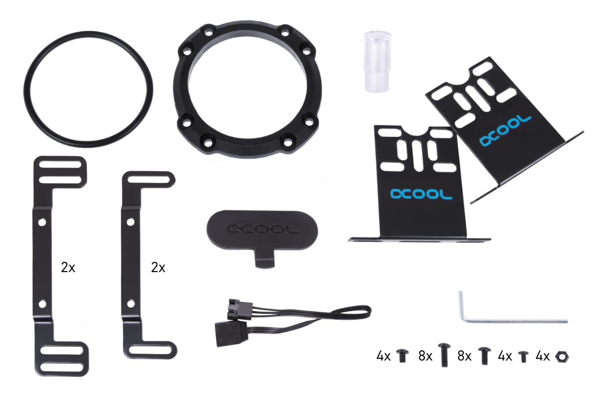 Im Lieferumfang befinden sich 120mm/140mm Montagerahmen, mit denen der Core Ausgleichsbehälter beliebig an freien Lüfterplätzen, Radiatoren oder an den Lüftern auf Radiatoren befestigt werden kann.