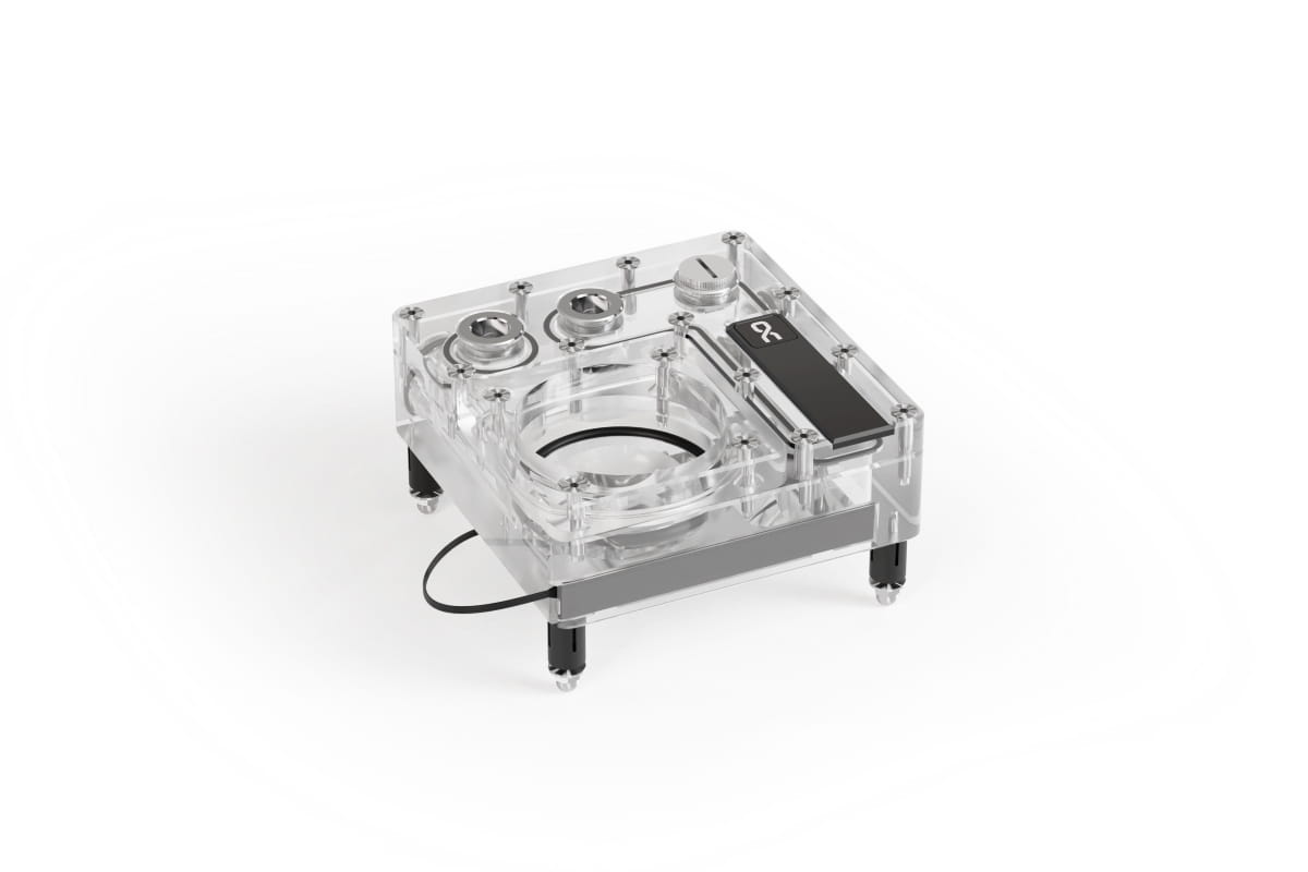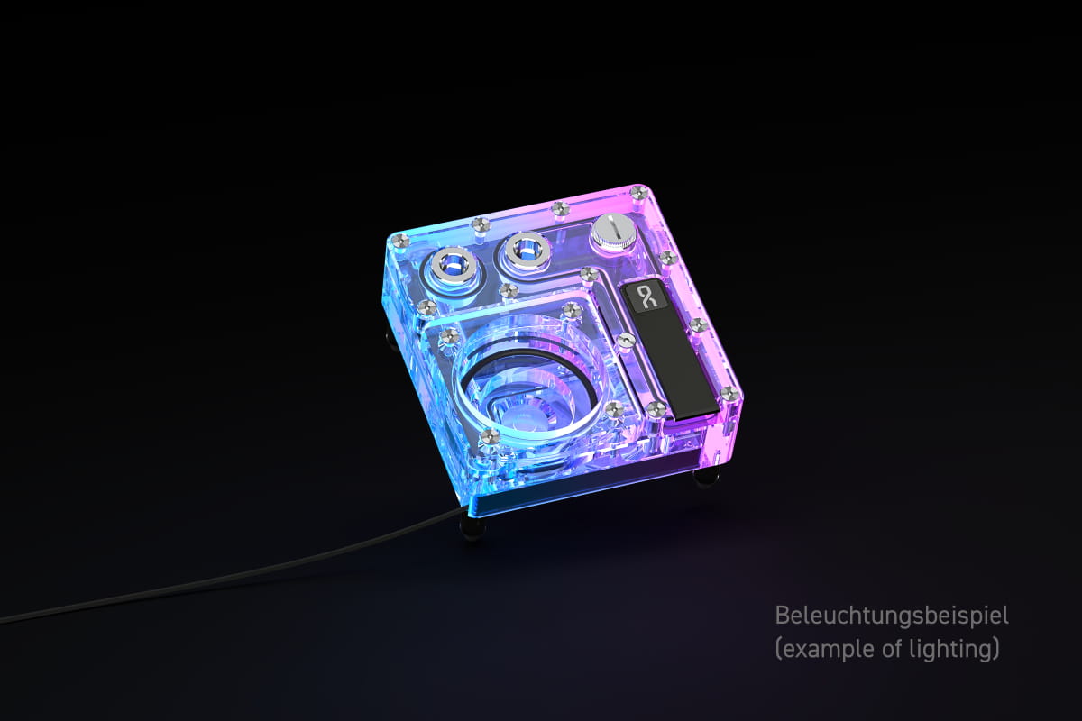 Alphacool's Core Reservior wird aus hochwertigem Acrylglas gefertigt. Das erlaubt einen freien Blick auf die Kühlflüssigkeit und ein brillantes Farbspiel durch die verbaute digital adressierbare aRGB-Beleuchtung. Die Beleuchtung kann über einen digitalen aRGB-Header am Mainboard oder optional durch Alphacool's Aurora Eiscontrol aRGB Controller (Artikel-Nr.: 15360) gesteuert werden.