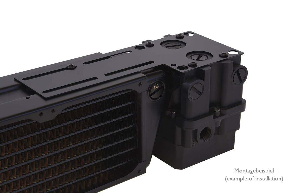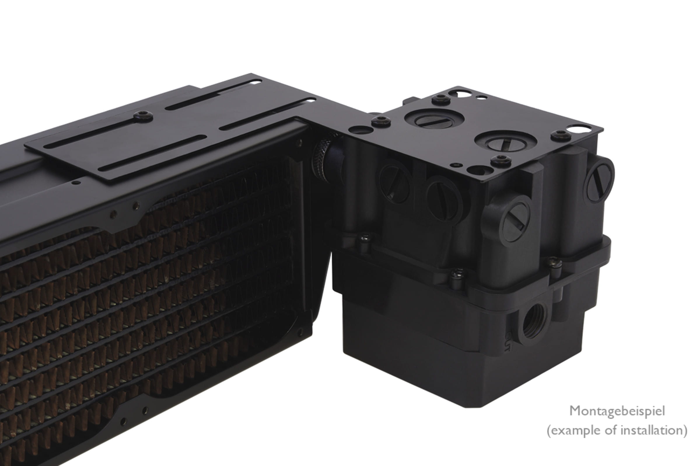 Für die Montage der Pumpe werden lediglich 4 Schrauben und ein O-Ring benötigt. Der O-Ring wird auf den Ausgleichsbehälter aufgelegt, die Pumpe aufgesetzt und mit vier Schrauben fixiert. Danach ist das Alphacool ES Reservoir 2U einsatzbereit.