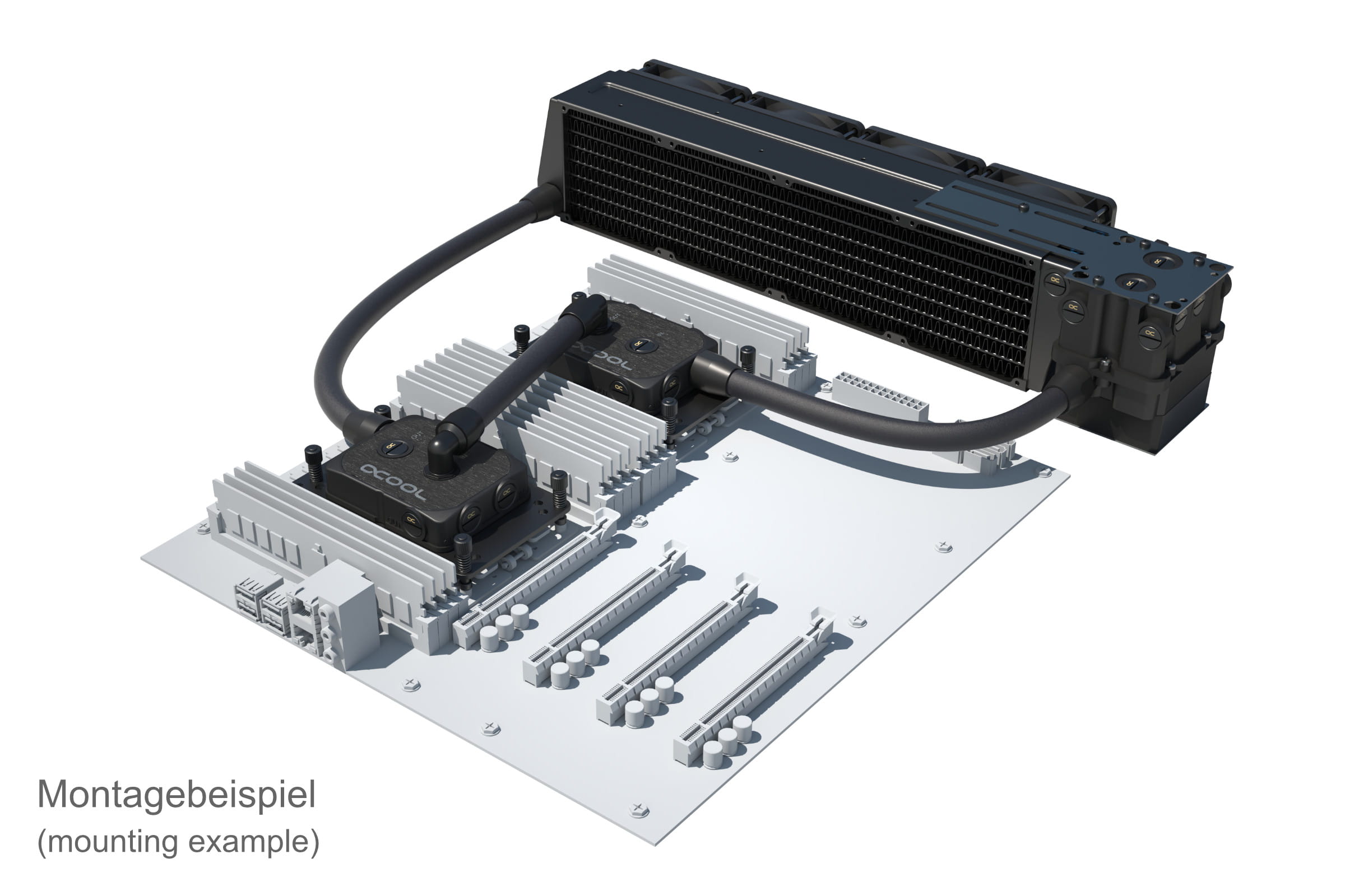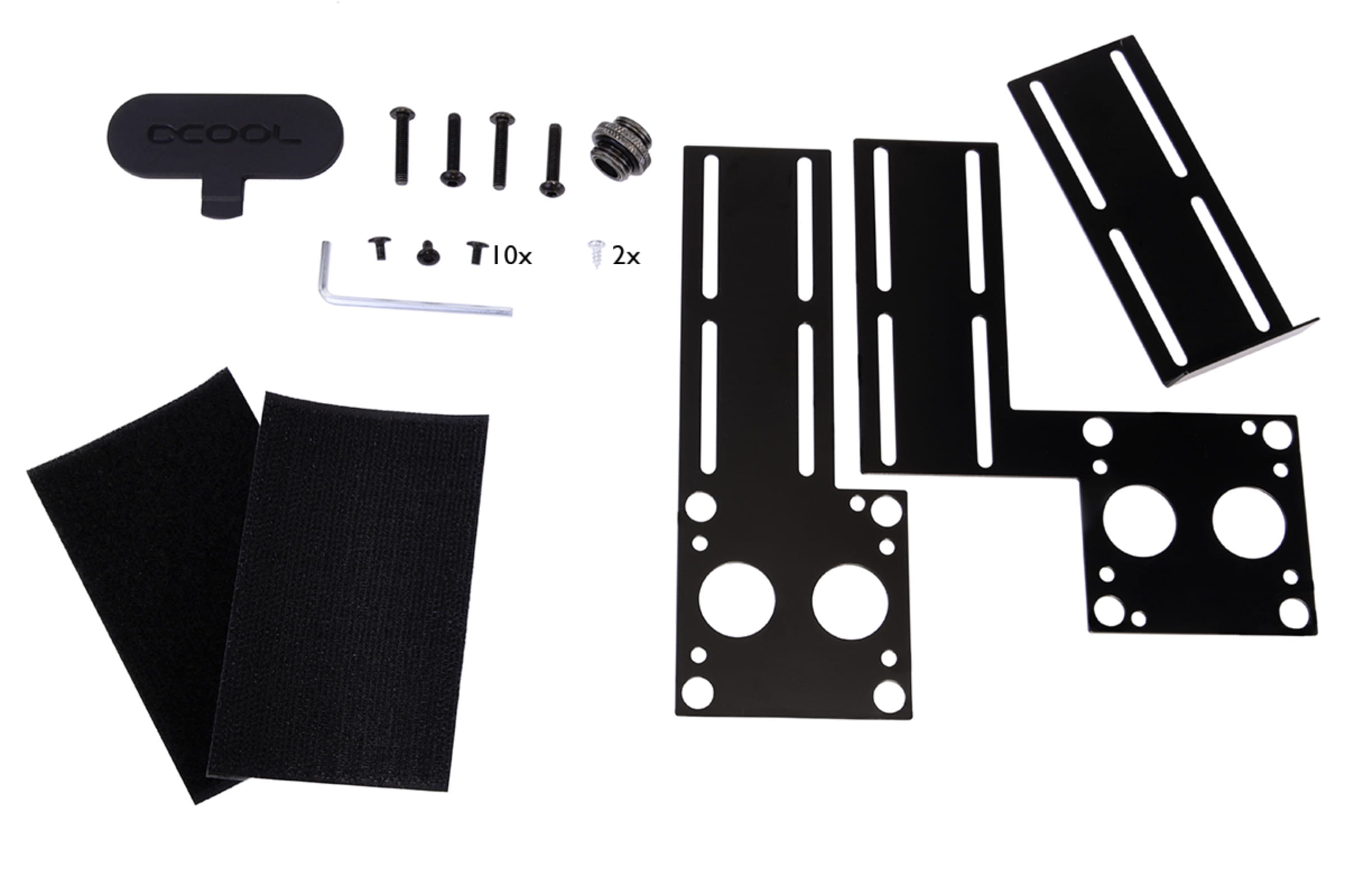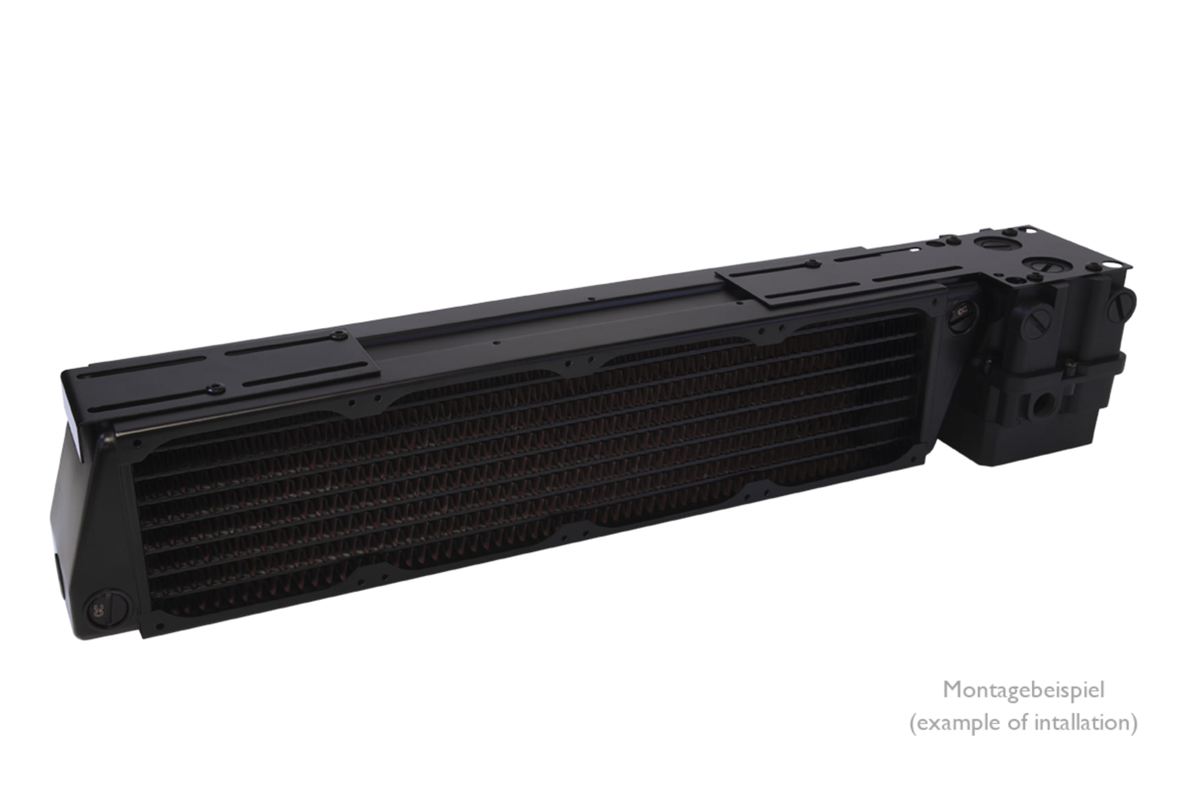 Idealerweise wird der ES 2U Ausgleichsbehälter direkt am Radiator montiert. Dafür liegen im Lieferumfang drei Montagerahmen und ein steckbarer Doppelnippel-Anschluss bei. Der Steckbare-Doppelnippel wird dabei als direkte Verbindung mit einem Alphacool NexXxoS Radiator der X-Flow Serie verwendet. Der Ausgleichsbehälter wird dann mit den beiliegenden Montagestreben direkt am Radiator befestigt. Die Alphacool NexXxoS X-Flow Radiatoren besitzen dafür natürlich passende Montagebohrungen. Durch diese Art der Montage ist es möglich, den Radiator und den Ausgleichsbehälter entweder nebeneinander zu positionieren oder versetzt vor dem Radiator. Die entsprechenden Möglichkeiten werden in der Anleitung genau aufgeführt.