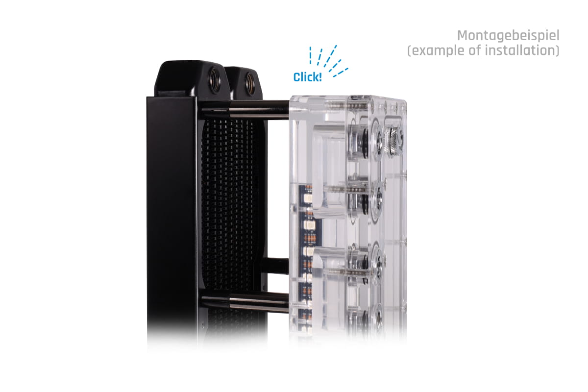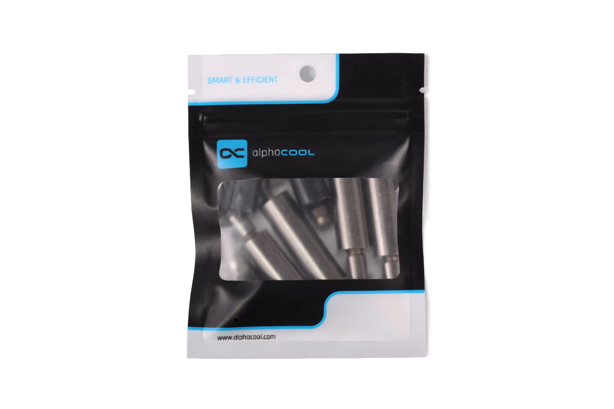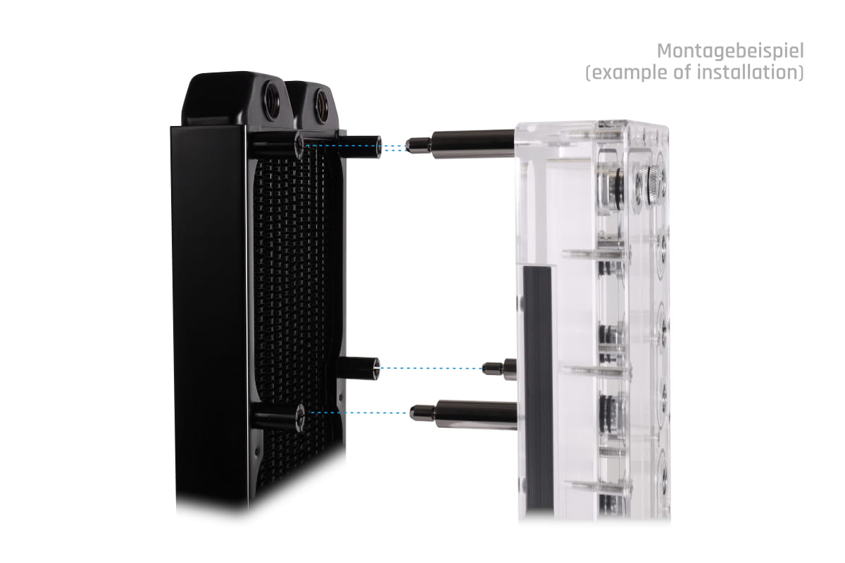 Das Core Push Mounting Kit bietet eine unkomplizierte und sichere Methode, um die Distro Plate von Alphacool an einem Radiator oder im PC Gehäuse zu montieren. Dazu werden die Metall-Pins an der Distro Plate festgeschraubt und die dazu passenden Hülsen am Radiator oder am PC Gehäuse angebracht. Im nächsten Montageschritt wird die Distro Plate werkzeuglos auf die Pins gesteckt. Das Alphacool Core Push Mounting System ermöglicht einen festen und stabilen Sitz der Distro Plate.