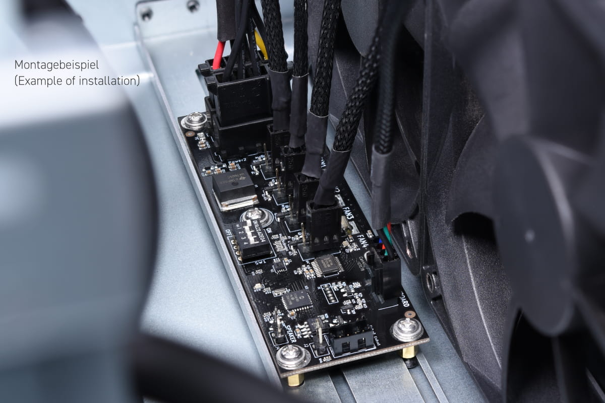 Der ES Guardian 4Port Powerfan Hub kann mit Hilfe von M3x4mm Schrauben und M3x6mm Abstandshaltern beliebig im Gehäuse platziert werden (siehe Montagebeispiel) und wird direkt an das Netzteil über das mitgelieferte Stromkabel angeschlossen. Für den Fall, dass die verwendeten Lüfter mehr als 1,5A (18W) pro Lüfter benötigen, ist ein weiterer Stromanschluss vorhanden. Er bietet die Möglichkeit, 4 Lüfter per 4-Pin PWM anzuschließen. Final muss der Powerfan Hub noch via 4-Pin PWM mit dem Mainboard verbunden werden. Sind diese Arbeitsschritte erledigt, können die 4 Lüfter überwacht und die Drehzahlen ausgelesen werden.