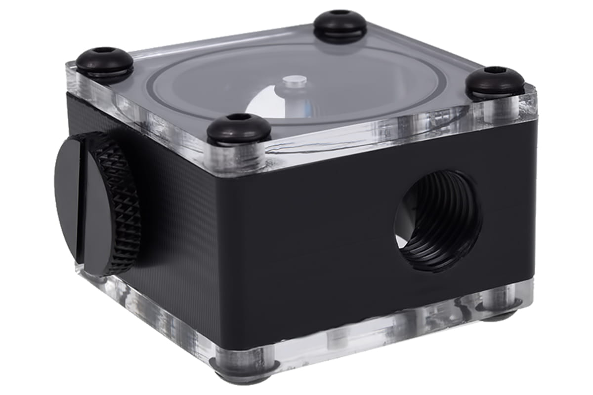Die Kombination aus Acetal und Acrylglas ist eine gelungene Kombination die sich nahtlos in jedes System einfügt. Außer den zwei 1/4" Gewinden die für das durchfließen des Wassers notwendig sind, hat der Alphacool Eisflügel ein weiteres Gewinde an der Oberseite welches für viele Zwecke genutzt werden kann: Beleuchtung, Fillport, Drainport oder auch als Winkelstück - die Funktion ist auch gewährleistet wenn das obere Gewinde als Auslass genutzt wird.