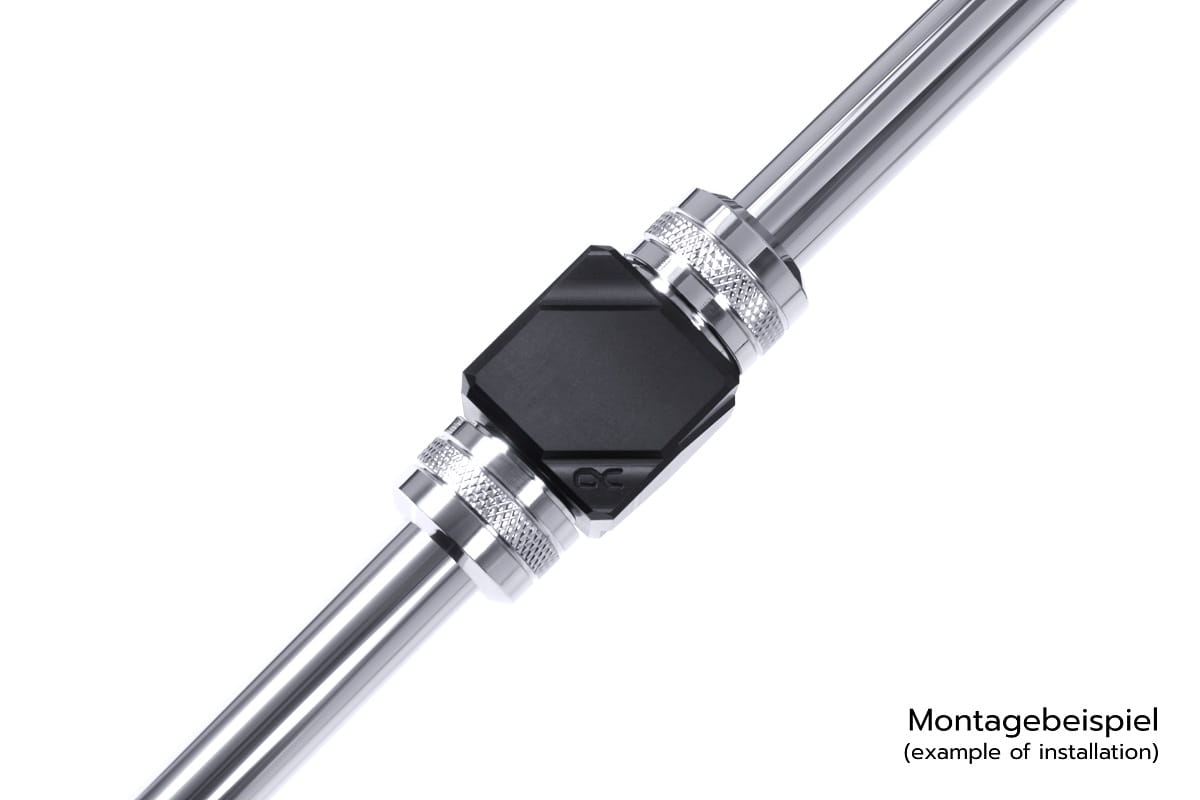 Der Temperatursensor ist sehr kompakt und kann durch seine zwei G1/4“ Innengewinde in jeden Wasserkreislauf eingebunden werden. Es spielt dabei keine Rolle ob das System mit Schläuchen oder HardTubes bestückt ist. Es werden einfach die entsprechenden Anschlüsse an den Sensor geschraubt und dann an einer beliebigen Position im Wasserkreislauf montiert. Durch die Verwendung von Acetal, ist der Temperatursensor mit lediglich 29g extrem leicht.