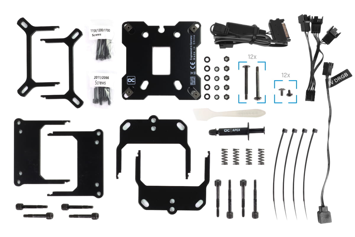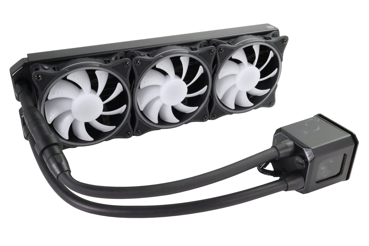 Der Kühlerboden besteht aus Kupfer und hat eine feine Schlitzstruktur. Die Fläche wurde gegenüber dem Vorgängermodell erweitert um die größeren DIE Flächen der AMD und Intel Prozessoren vollständig abzudecken. Die DC-LT Pumpe wurde ebenfalls überarbeitet und ist nun um etwa 10% Leistungsfähiger bei einer nochmals verringerten Lautstärke. Der Ausgleichsbehälter ist im Vergleich zu handelsüblichen AIO Systemen um ein vielfaches größer. Das sorgt für eine längere Lebensdauer. Außerdem befindet sich auf der Kühlereinheit auch ein Fillport über den man gegebenenfalls auch Flüssigkeit nachfüllen kann. Das ist vor allem wichtig wenn man den Kreislauf über die Schnellverschlüsse erweitern möchte.