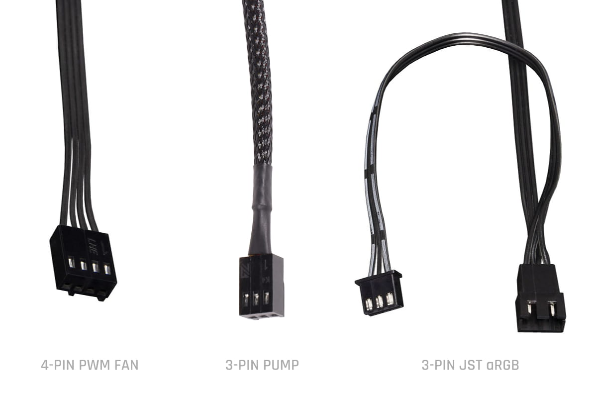 Die Lüfter werden ganz normal über einen 4-Pin PWM Stecker angesteuert. Damit man nicht alle Lüfter einzeln an das Mainboard anschließen muss, liegt ein entsprechend passendes Y-Kabel bei. Die RGB Beleuchtung wird über einen 3-Pin JST Stecker angeschlossen. Jedes Kabel hat zudem einen integrierten Y-Adapter wodurch die Lüfter sehr leicht zusammengeschlossen werden können. Ein 3-Pin 5V Adapter liegt der Verpackung bei. Damit kann man die Lüfter auch an jedes Mainboard mit entsprechendem Anschluss anschließen und ansteuern. Alternativ kann auch der beiliegende Digital RGB Controller verwendet werden. Die Pumpe der Eisbaer Aurora verwendet einen 3-Pin Molex Stecker. Dieser kann ebenfalls am Mainboard angeschlossen werden.