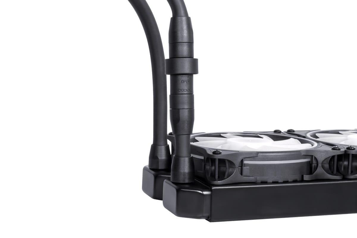 Die Eisbaer Pro Aurora besteht fast vollständig aus echten Wasserkühlungskomponenten. Die extrem robusten und langlebigen TPV Schläuche werden auch bei den Enterprise Produkten für Server und Workstations verwendet. Die Schlauchanschlüsse kommen ebenfalls aus der Enterprise Serie von Alphacool und verwenden das Standard G1/4“ Gewinde. Dadurch ist die Eisbaer Pro Aurora voll kompatibel zu allen gängigen Wasserkühlungsprodukten. Der Schnellverschluss erlaubt eine einfache Erweiterung der AIO mit weiteren Komponenten. Hier sind vor allem die vorbefüllten Radiatoren und die Eiswolf GPU AIO Wasserkühlung zu benennen.