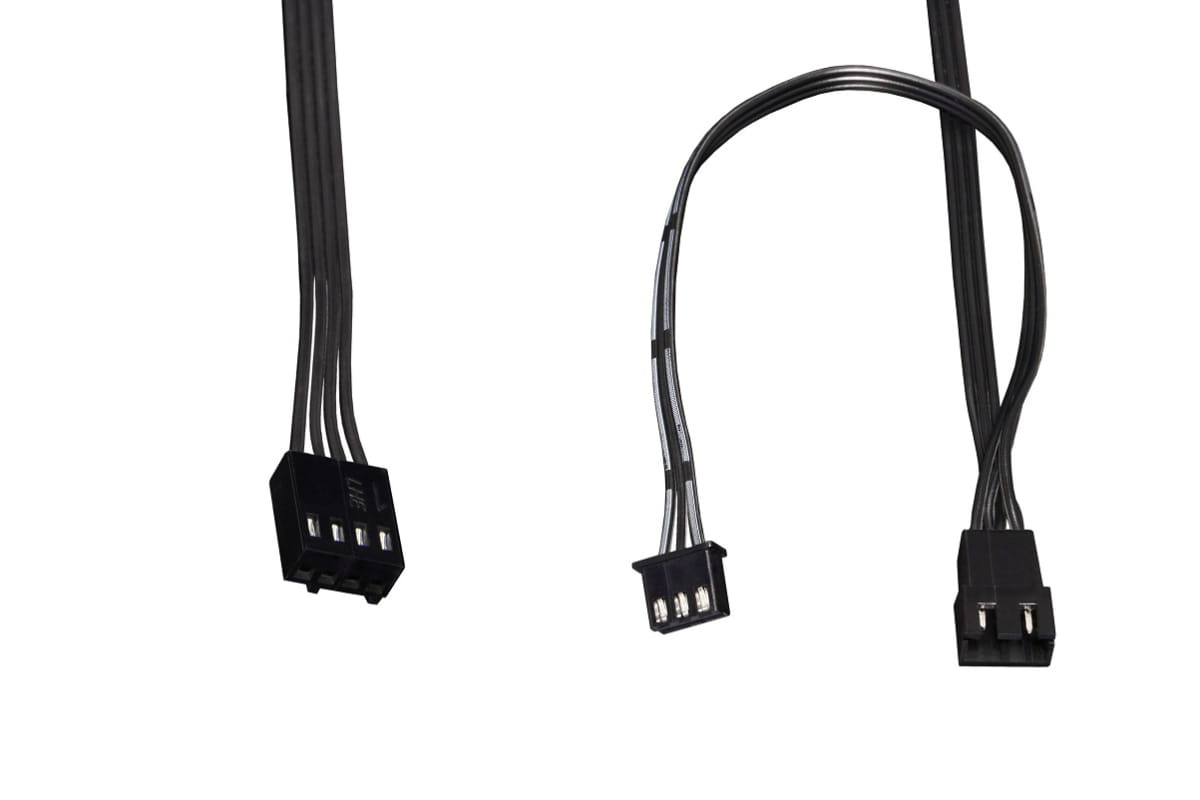 Die Lüfter werden ganz normal über einen 4-Pin PWM Stecker angesteuert. Ein im Lieferumfang beiliegender Y-Adapter für die Lüfter erleichtert das Anschließen auf dem Mainboard. Damit können alle Lüfter über einen Anschluss angesteuert und geregelt werden. Jeder Lüfter besitzt für die LED Beleuchtung einen 3-Pin JST Anschlussstecker inklusive Y-Adapter. Dadurch können die Lüfter direkt zusammengeschlossen werden und synchron über einen Controller geregelt werden. Für den Anschluss an einem typischen 3-Pin 5V Anschluss liegt ein entsprechender Adapter bei. Alternativ kann auch der beiliegende Digital RGB Controller verwendet werden. Die Pumpe der Eisbaer Aurora verwendet einen 3-Pin Molex Stecker. Dieser kann ebenfalls am Mainboard angeschlossen werden.