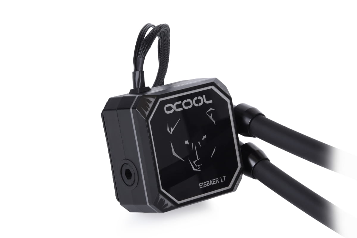 Die Kühler-Pumpeneinheit und die Lüfter sind komplett mit Digital RGB LEDs bestückt, auch bekannt als adressable RGB oder aRGB. Mit dem beiliegenden Controller oder einer Digital RGB Steuerung am Mainboard lassen sich umfangreiche Effekte einstellen. Für einen schönen optische Effekt sorgt natürlich der beleuchtete Eisbaer auf der Kühler-Pumpeneinheit. Zur einfacheren Ansteuerung über einen Controller, lassen sich die Lüfter und auch die Pumpe als Daisy-Chain in Reihe schalten. Das sorgt für eine saubere Verkabelung der einzelnen LED-Komponenten.