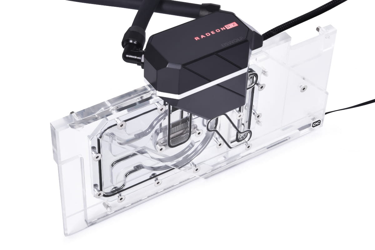 Der Eiswolf 2 Grafikkarten AIO Wasserkühler kühlt nicht nur die GPU mit Wasser sondern alle relevanten Bauteile die eine aktive Kühlung benötigen. Dazu gehören der Grafikspeicher, die Spannungswandler und gegeben falls noch weitere Bauteile die zwingend eine direkte Kühlung benötigen. Durch die Verwendung des Eisblock GPX Aurora Wasserkühlers als Basis, ist die Kühlleistung identisch mit der eines DIY Grafikkarten Wasserkühlers