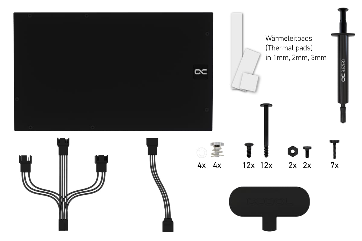 Der Eiswolf 2 Grafikkarten AIO Wasserkühler kühlt nicht nur die GPU mit Wasser sondern alle relevanten Bauteile die eine aktive Kühlung benötigen. Dazu gehören der Grafikspeicher, die Spannungswandler und gegeben falls noch weitere Bauteile die zwingend eine direkte Kühlung benötigen. Durch die Verwendung des Eisblock GPX Aurora Wasserkühlers als Basis, ist die Kühlleistung identisch mit der eines DIY Grafikkarten Wasserkühlers
