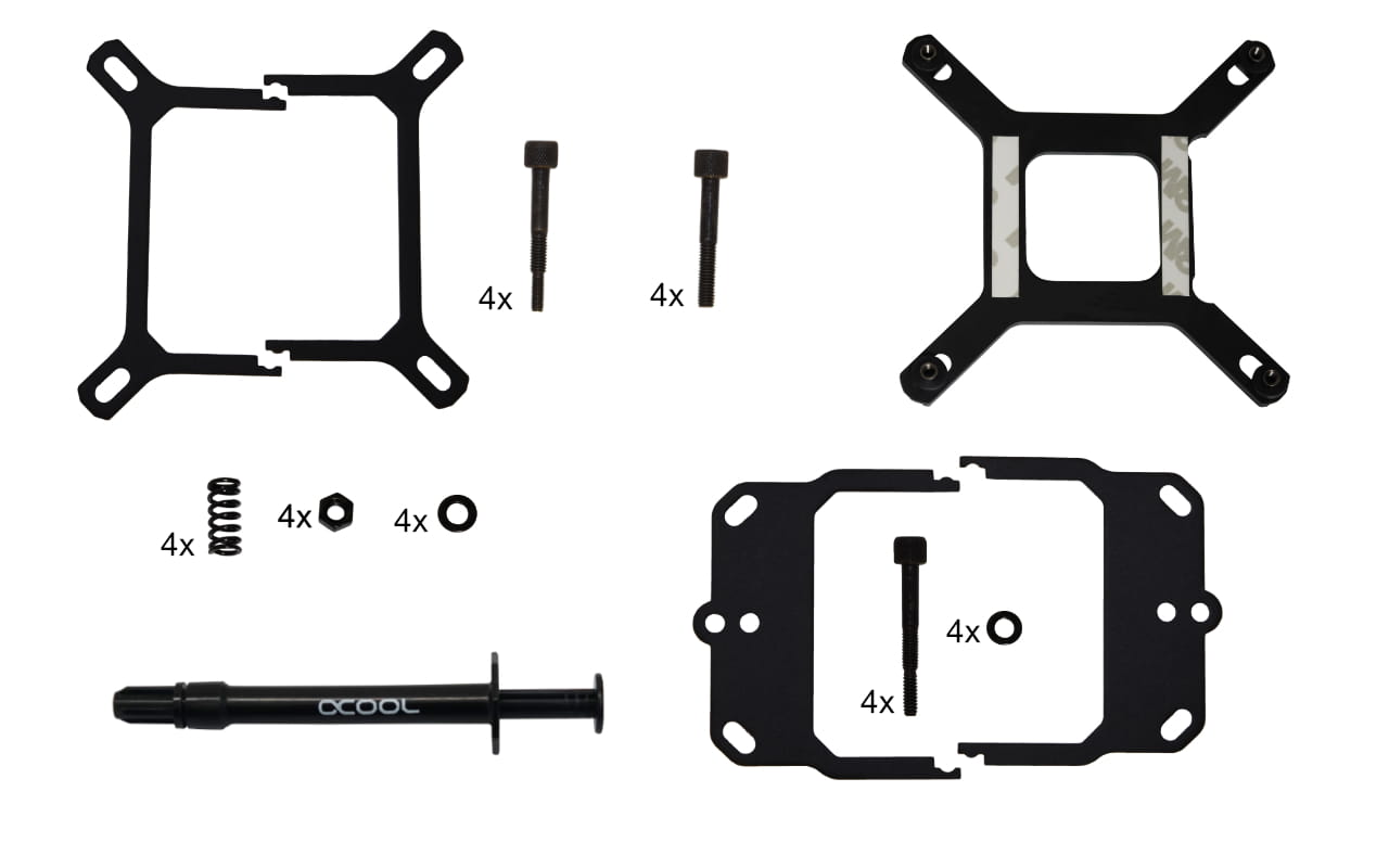 Die Backplate wird von hinten an das Mainboard angeklebt. Danach erfolgt eine Vormontage des Halterahmens und der Montageschrauben direkt am CPU Wasserkühler. Im letzten Schritt wird der Kühler mit den vormontierten Montageshrabauben auf die CPU aufgesetzt und mit der Backplate verschraubt. Es liegt Montagematerial für alle Mainstream Sockel von AMD und Intel bei. Lediglich für einige Intel Xeon Sockel und dem AMD Threadripper fehlt das Montagematerial, jedoch empfehlen wir dafür die Eisblock XPX Pro Reihe. Dieser bietet angepasstes Montagematerial und eine vergrößerte Kühlfläche für diese Übergroßen Prozessoren.