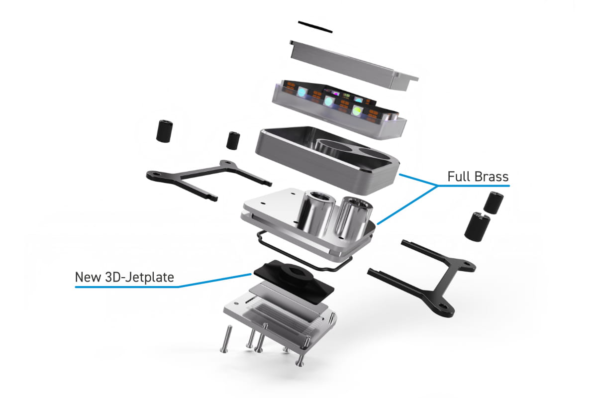 Alphacool bringt mit dem Core 1 das Beste beider Welten zusammen. Neben der neuen 3D-Jetplate kehrt Alphacool zu seinen Wurzeln zurück, indem die Kühlflüssigkeit durch eine bewährte Kreuzschlitztechnik gleichmäßig auf dem überarbeiteten Kühlerboden verteilt wird. Im Inneren des Kühlers sorgen O-Ringe für einen präzisen Wasserfluss und gewährleisten somit eine effektive Kühlung. Das Gehäuse des Core 1 wird aus einem hochwertigen Messingblock gefräst und verfügt über vernickelte Anschlüsse. Der ebenfalls vernickelte Kupferboden des Kühlers wurde vergrößert, um eine vollständige Abdeckung großer CPUs zu gewährleisten.