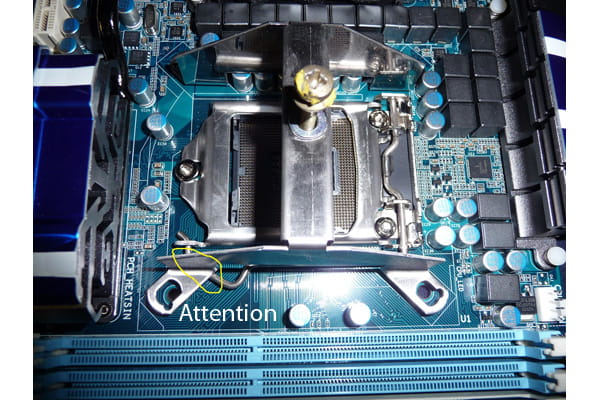 Attention: Sollte die Halterklammer wie in dem Beispielbild bei der Klammer für die CPU im Weg sein, hilft eine Überbrückung mit Unterlegscheiben z.B. durch Artikelnummer: 94523.