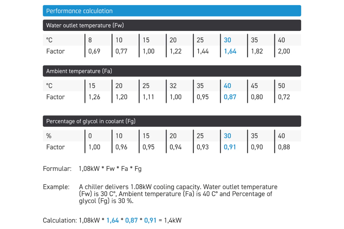 Beispiel: Ein Chiller liefert 1.08kW Kühlleistung. Wasseraustrittstemperatur (Fw) ist 30 °C, Umgebungstemperatur (Fa) ist 40 °C und Prozentsatz des Glykols (Fg) ist 30 %.