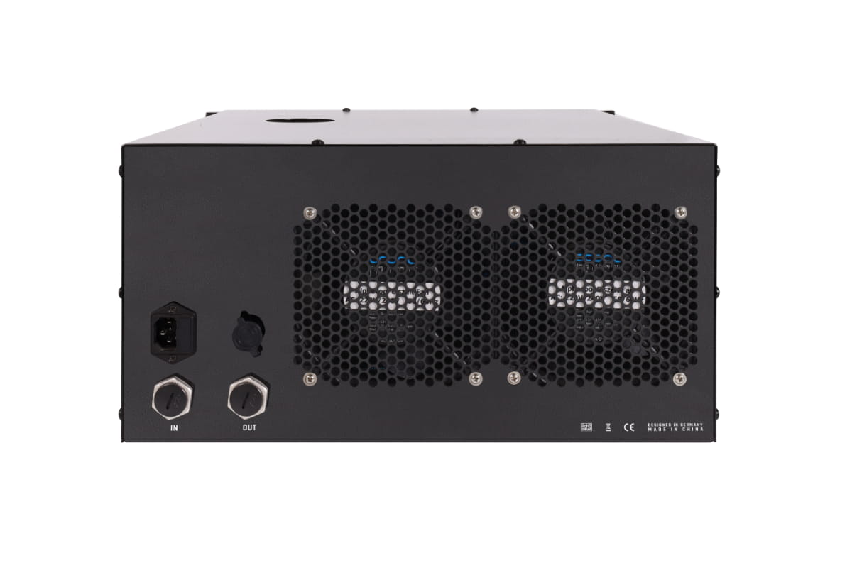 Der ES Chiller ServerRack 5HE ist mit einem Display ausgestattet, über das verschiedene Einstellungen, einschließlich der Temperaturregelung in präzisen Schritten von 0,3 °C, vorgenommen werden können. Die G1/4"-Anschlüsse sind kompatibel mit den gängigen Anschlüssen für Wasserkühlungssysteme. Ein eingebauter Ausgleichsbehälter bietet ein Fassungsvermögen von 2 Litern. Dank der integrierten Pumpe, mit einer maximalen Förderhöhe von bis zu 10 m, lässt sich der Chiller direkt in den Kühlkreislauf integrieren. Eine extra Pumpe ist nicht notwendig. Für zusätzliche Sicherheit ist der Chiller mit einem Überspannungsschutz für den Kompressor ausgestattet und verfügt über einen Alarm, der bei zu niedrigem Durchfluss oder Übertemperatur warnt.