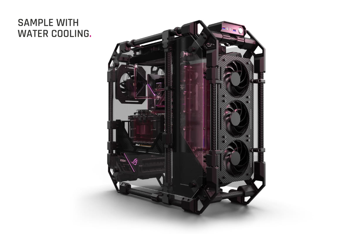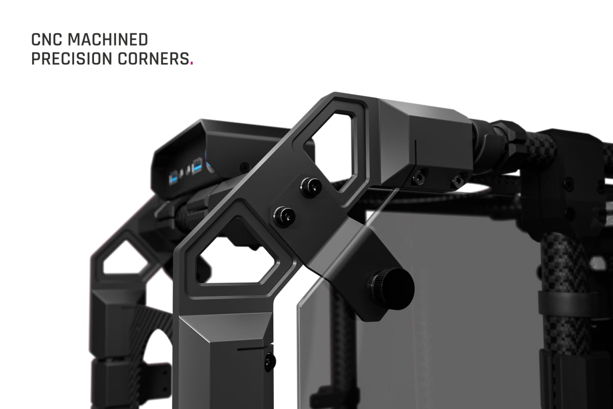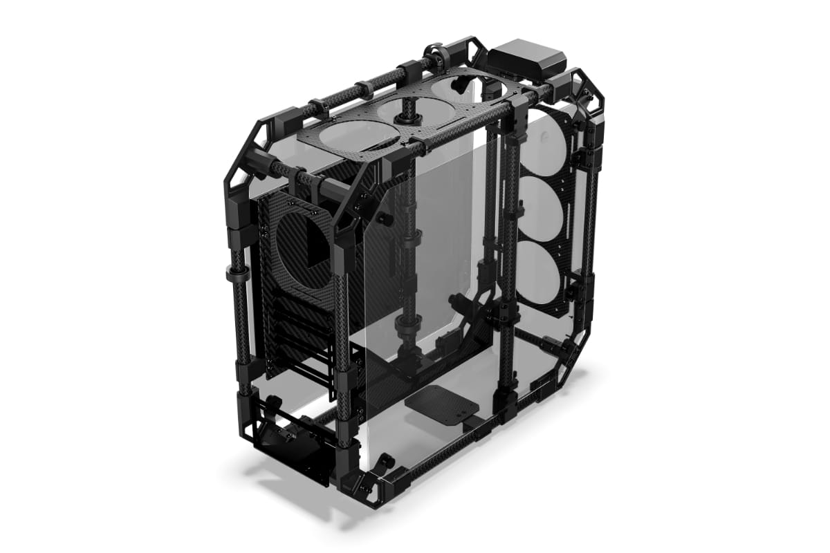 Grenzenlose Freiheit mit dem Alphacool Apex Skeleton. Das aus Carbon-Stangen und CNC-gefrästen Aluminium-Verbindungsstücken gefertigte Gehäuse wurde speziell für die Anforderungen von Wasserkühlungssystemen entwickelt. In dieser Ausführung kommt es ohne Distro Plate, Pumpe und ohne vertikale GPU-Halterung. Dadurch ermöglicht es zusätzlichen Spielraum für Kreativität. Das Skeleton bleibt dabei vollständig demontierbar und lässt sich ganz nach persönlichen Vorstellungen anpassen.