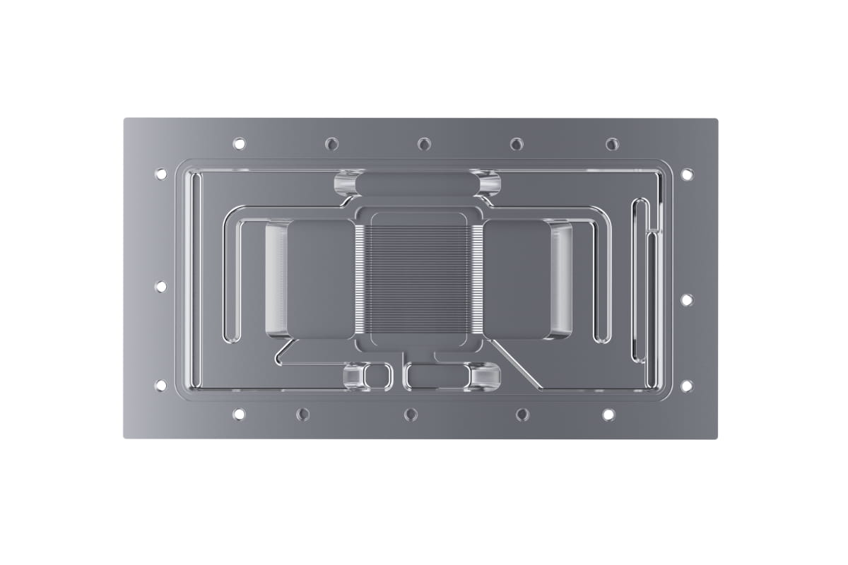 Die Finnenstruktur dieser Eisblock Kühlergeneration wurde gemeinsam mit AMD-Boardpartnern entwickelt. Die Finnendicke beträgt 0.4 mm, der Abstand der Kühlfinnen zueinander 0,4 mm. Das gewährleistet einen sehr guten Wasserdurchfluss bei gleichzeitiger Erhöhung der möglichen Kühlfläche. Die Düsenplatte verfügt über ein überarbeitetes Inlay, dass den Wasserdruck besser auf die Finnen verteilt und die Wärmeaufnahme optimiert. Der angepasste Wasserzufluss verhilft dem Wasser zu einem besseren Einströmwinkel.