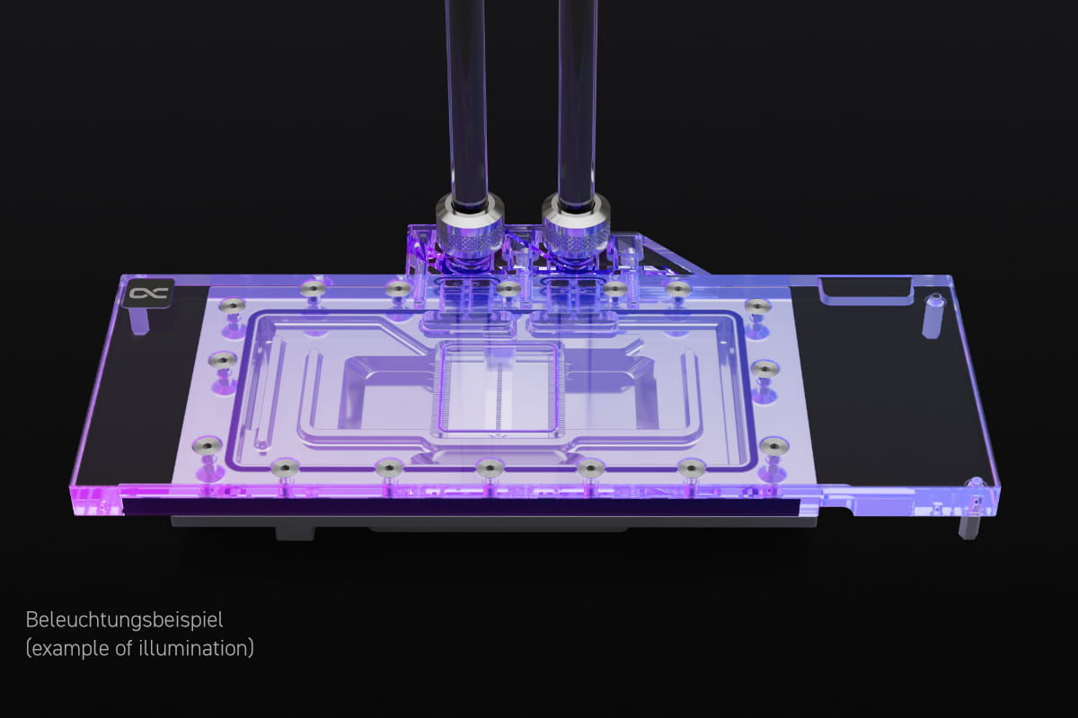 Das Aurora Design der Radeon RX 7XXX Eisblock Generation ist optisch ruhiger und schlichter. Nur ein O-Ring umläuft den gesamten Kühler. Die Konstruktion rund um die Kühlfinnen und der Jetplate sorgt für eine klarere Optik. Die Beleuchtung der digital adressierbaren RGB-LEDs wird dank der Verchromung noch besser im Kühler verteilt. Das Terminal entspricht in seiner Formgebung dem klassischen Aurora Design.