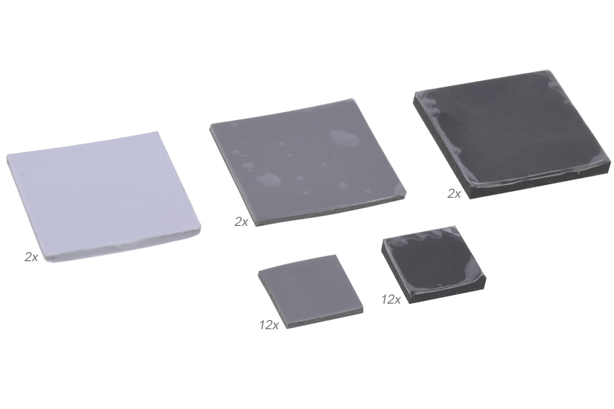 Dank der 2 verschiedenen Größen (30x30mm und 15x15mm) und der 3 verschiedenen Dicken (1,5; 2 und 3mm) ist jeder Fleck, der die Wärme an den Kühlkörper übertragen soll zu decken.